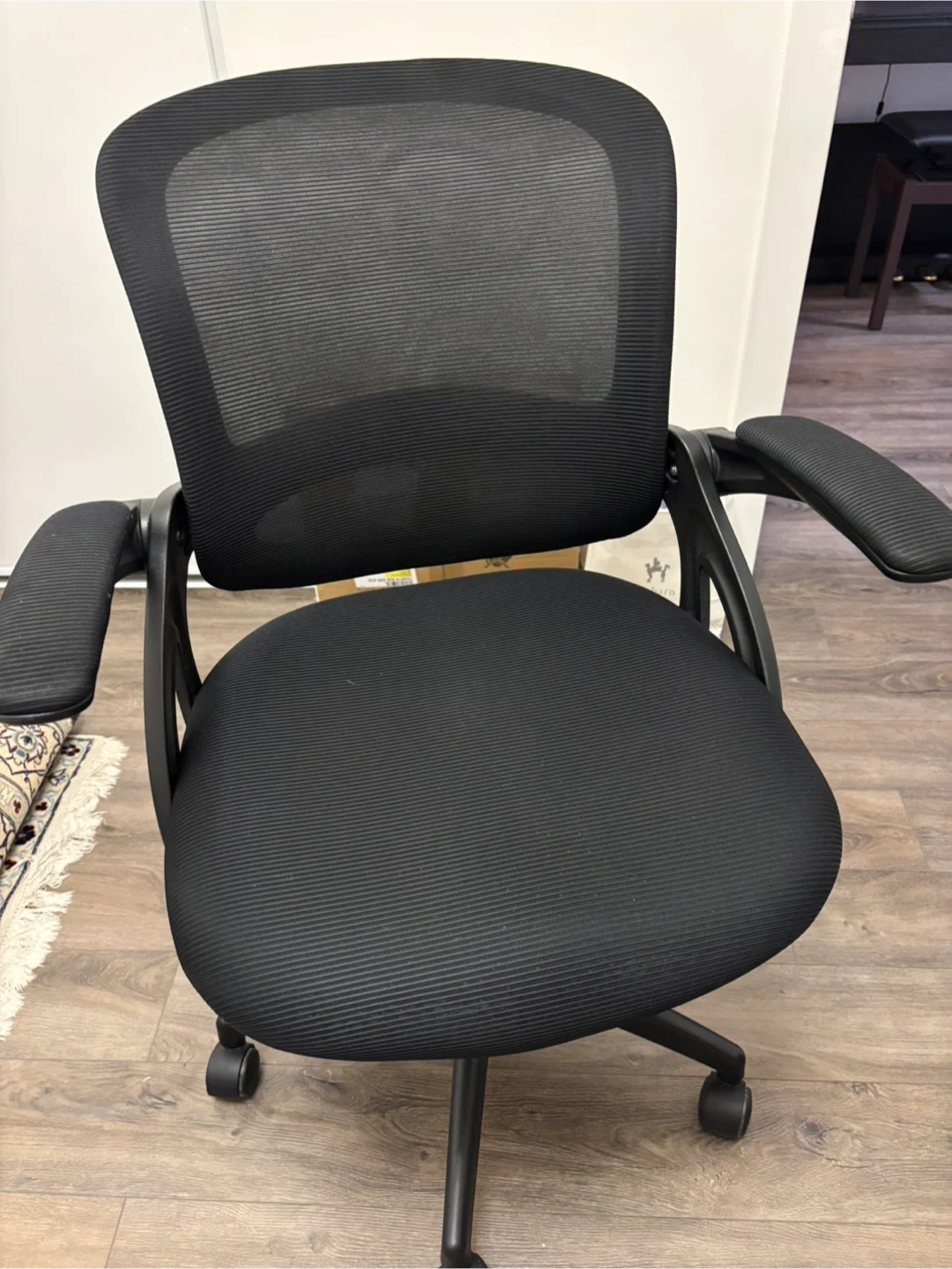 Selling a comfortable black office chair! It's in great shape and ready for a new home office setup. Perfect for long hours of work or study. It features a mesh back for breathability and adjustable armrests for added comfort
