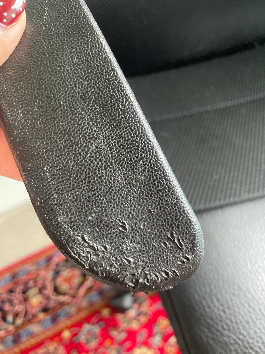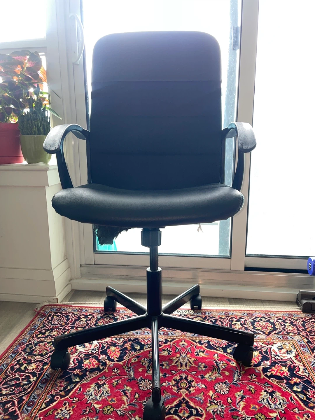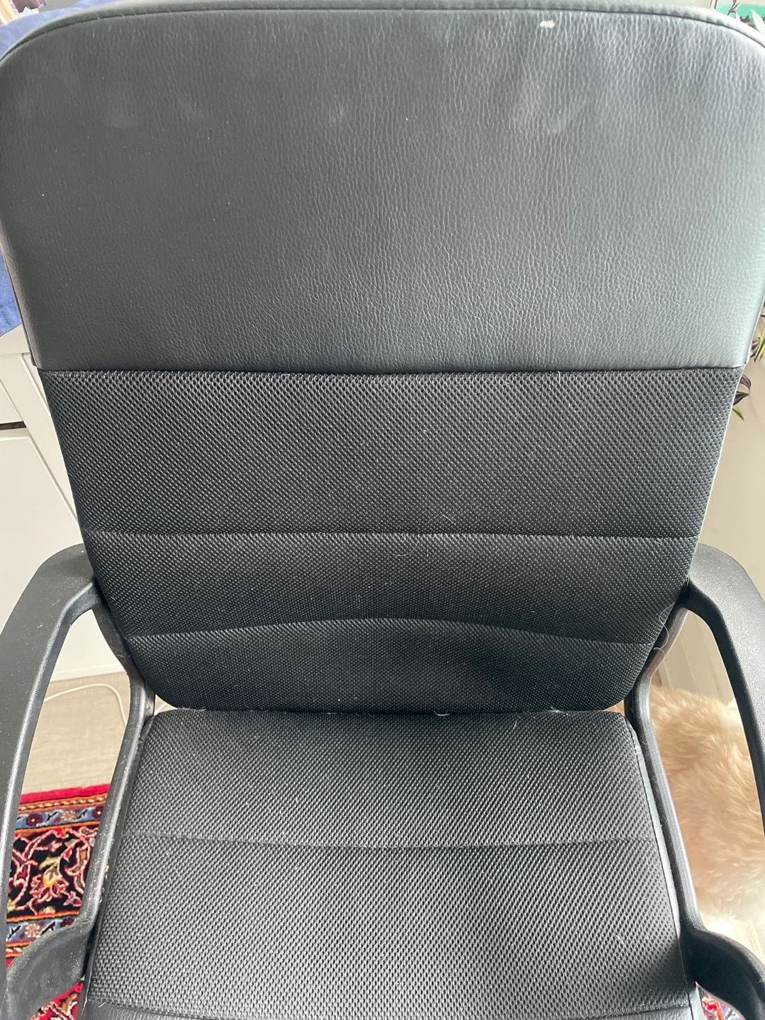 Selling a used black office chair. It has some wear and tear, as you can see in the pictures. There's some peeling on the armrests and base. Still functions as a chair. I have dog that’s a sign of her😄
