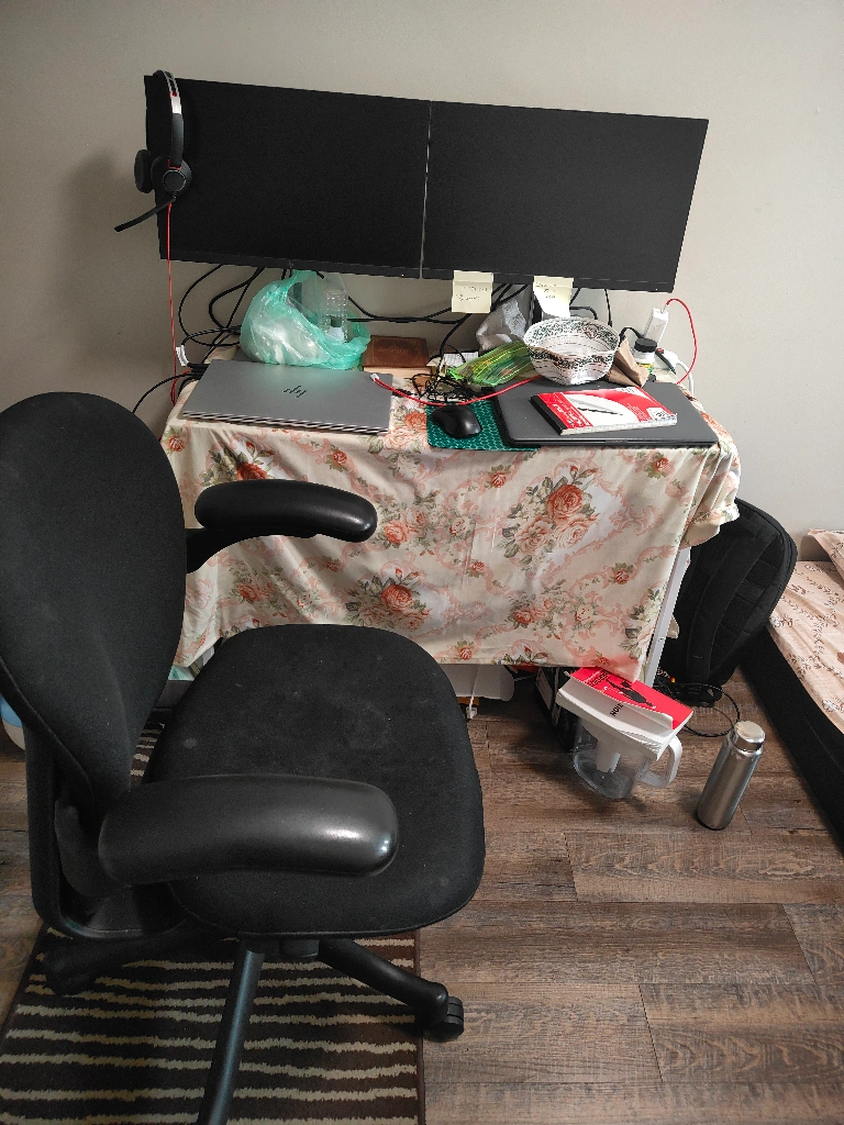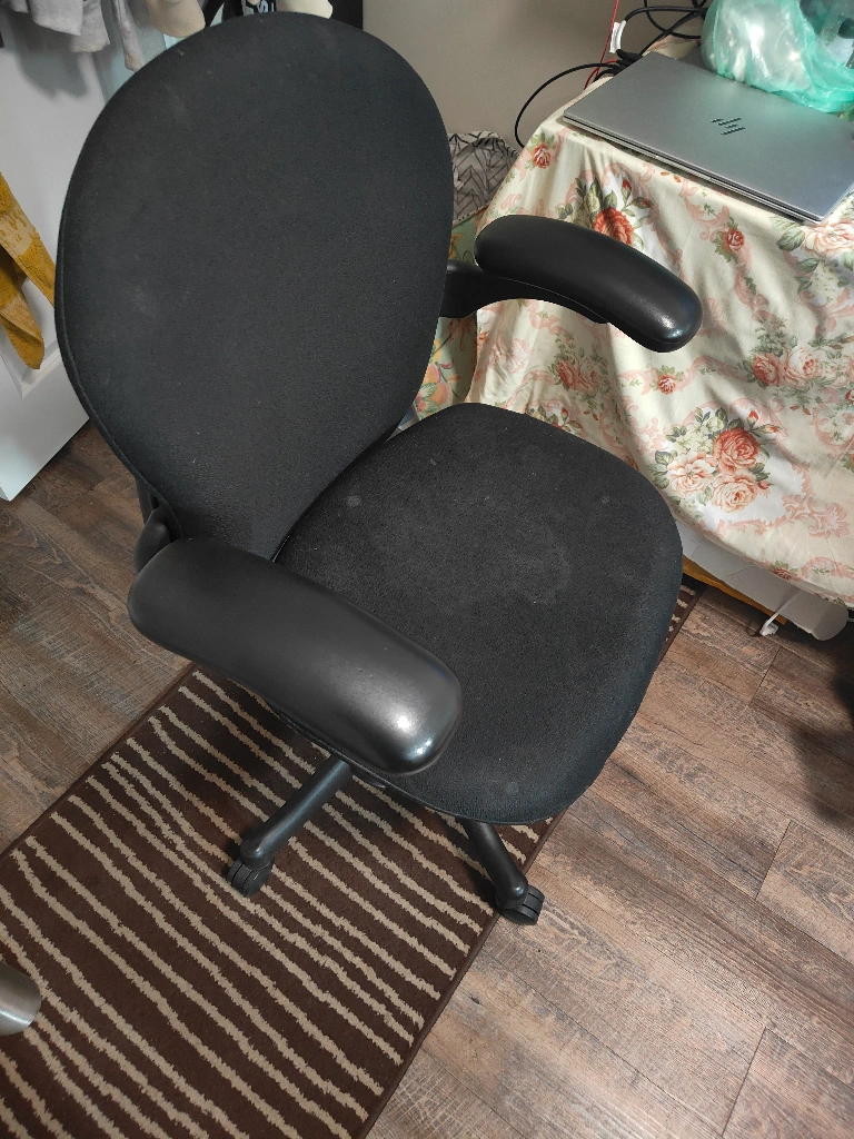 Selling a black office chair, perfect for your home office setup. Also included is a white desk frame with adjustable feet for various flooring types and an X-frame design for strong support