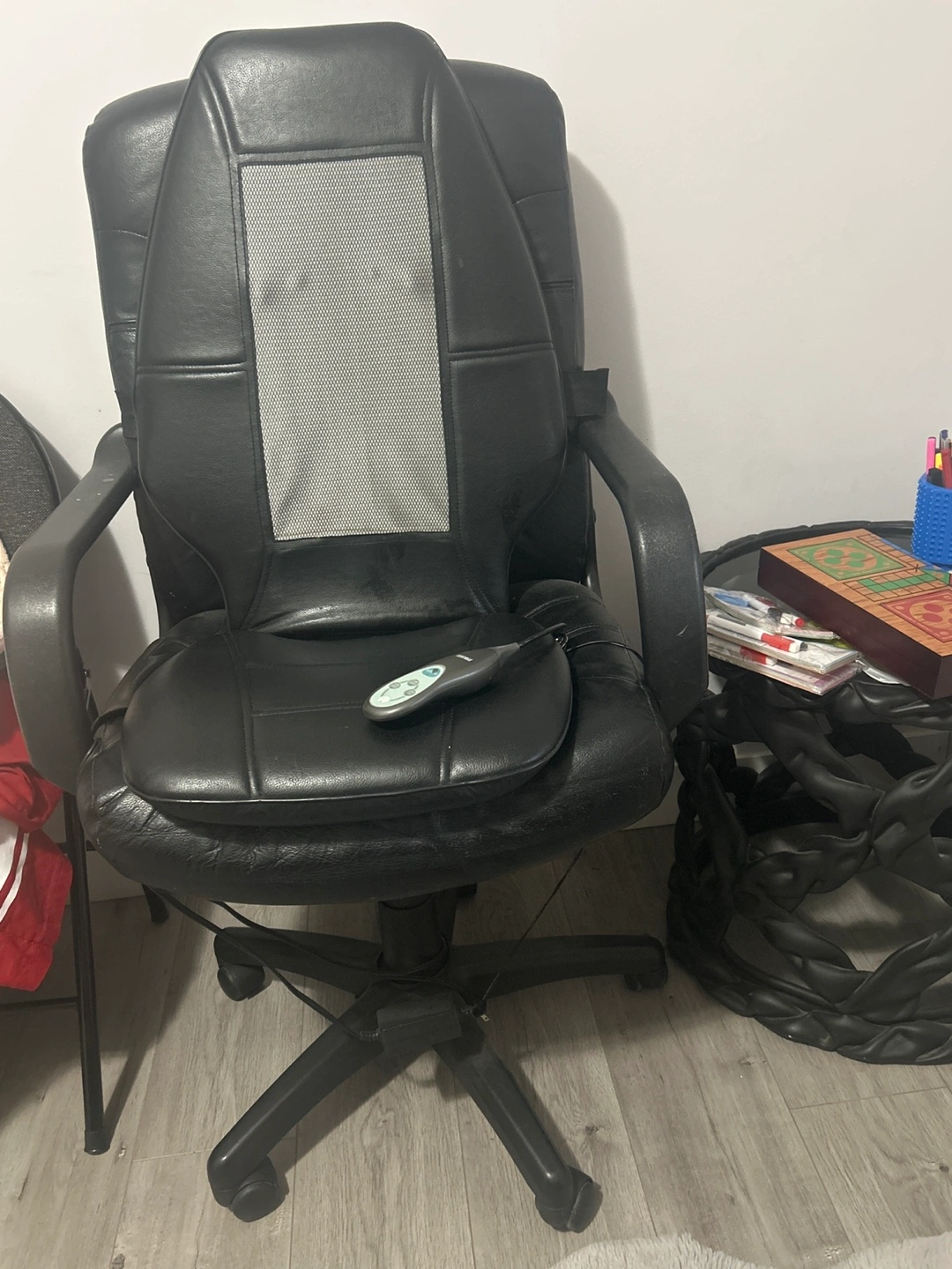 Selling a black office chair that's still in good condition. It comes with a massage function to help you relax during long workdays. Perfect for a home office or study space!