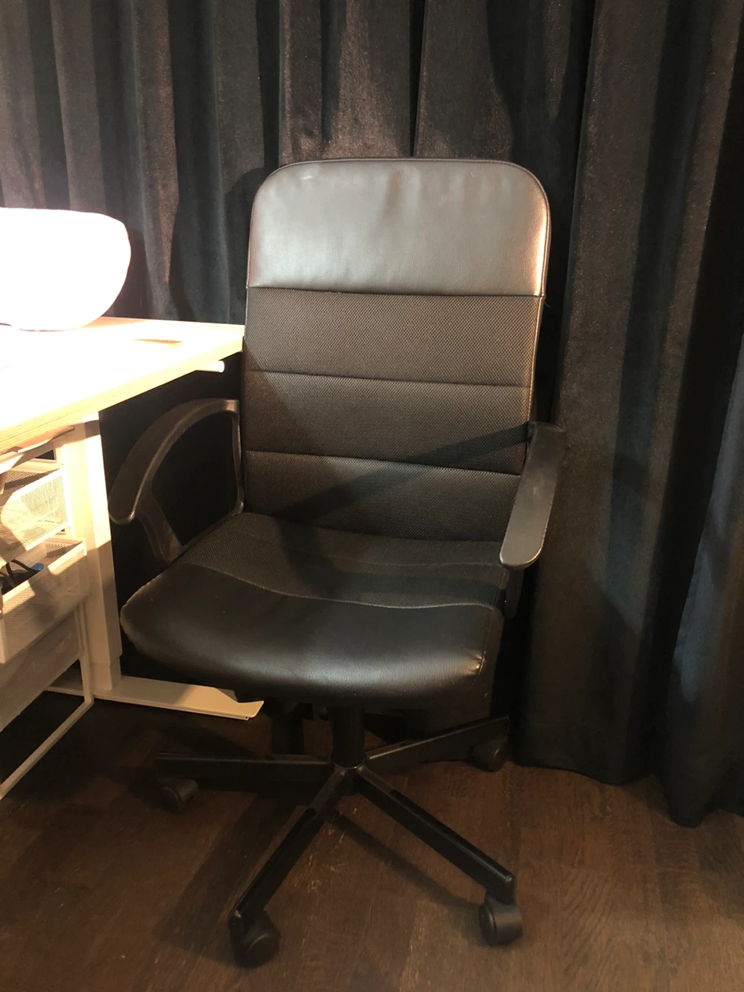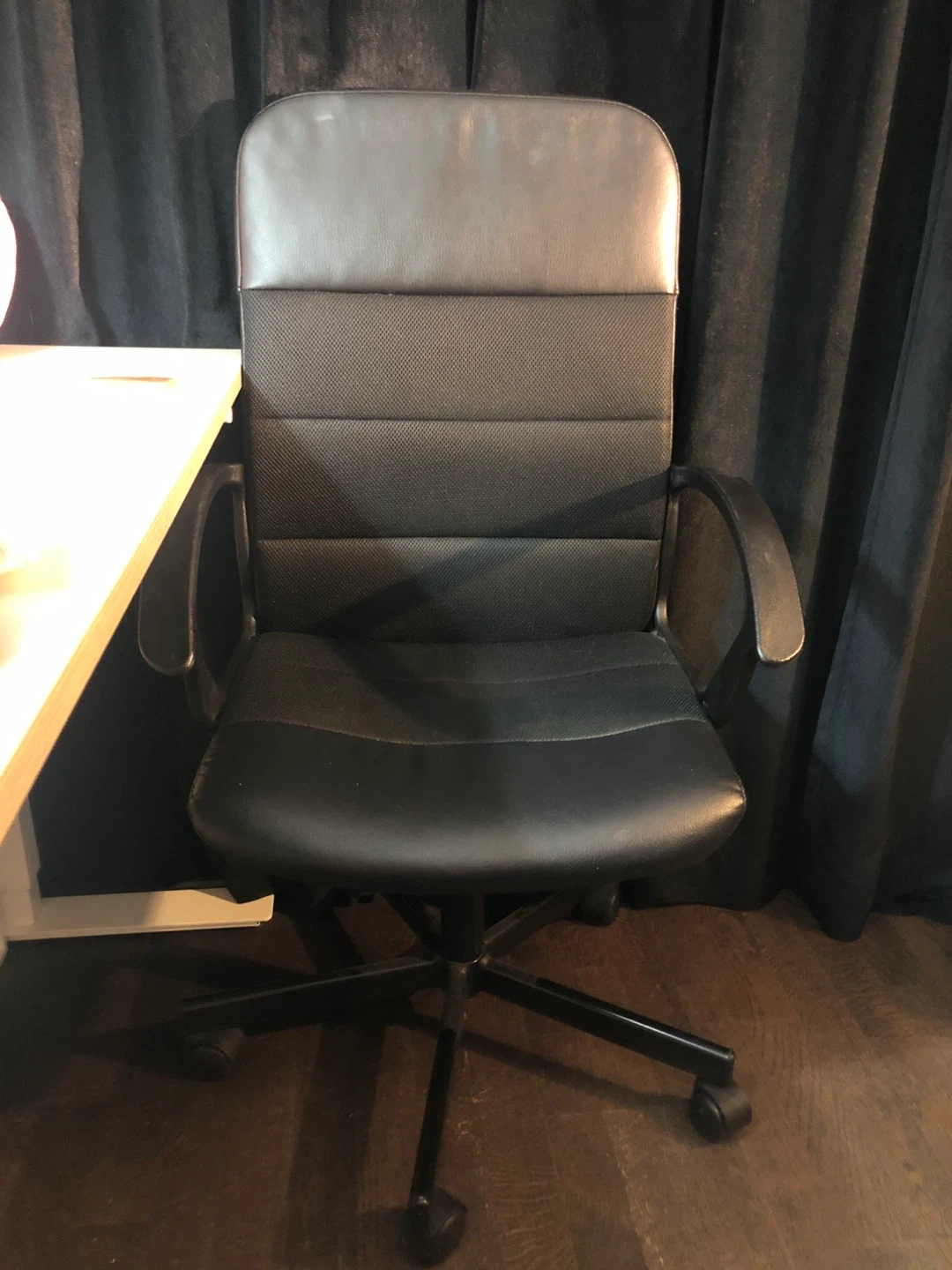 Selling a gently used black office chair! It's in great shape and ready to provide comfortable seating for your home office or workspace. The chair features a high back for support and adjustable height to suit your needs. It also has a swivel base for easy movement