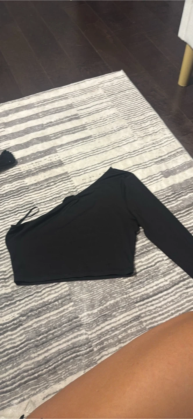 Selling a stylish black one-shoulder long sleeve top! It's in great condition and ready for a new home. Perfect for dressing up or down, this top is a versatile addition to any wardrobe