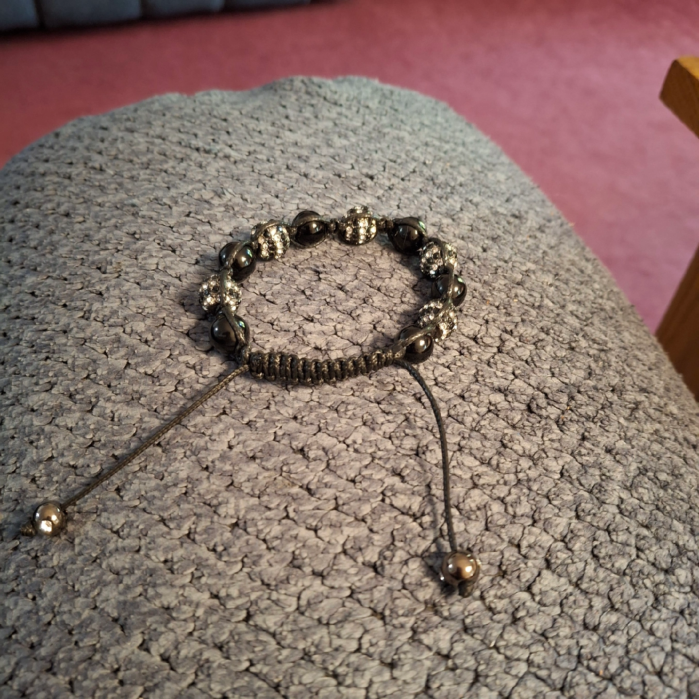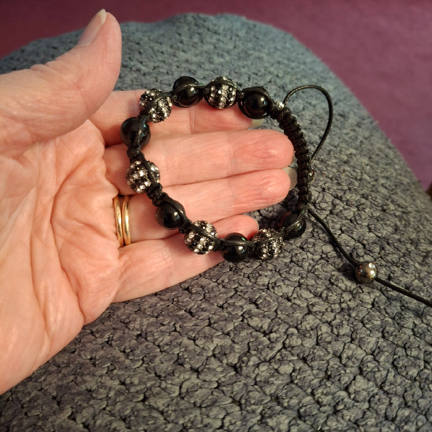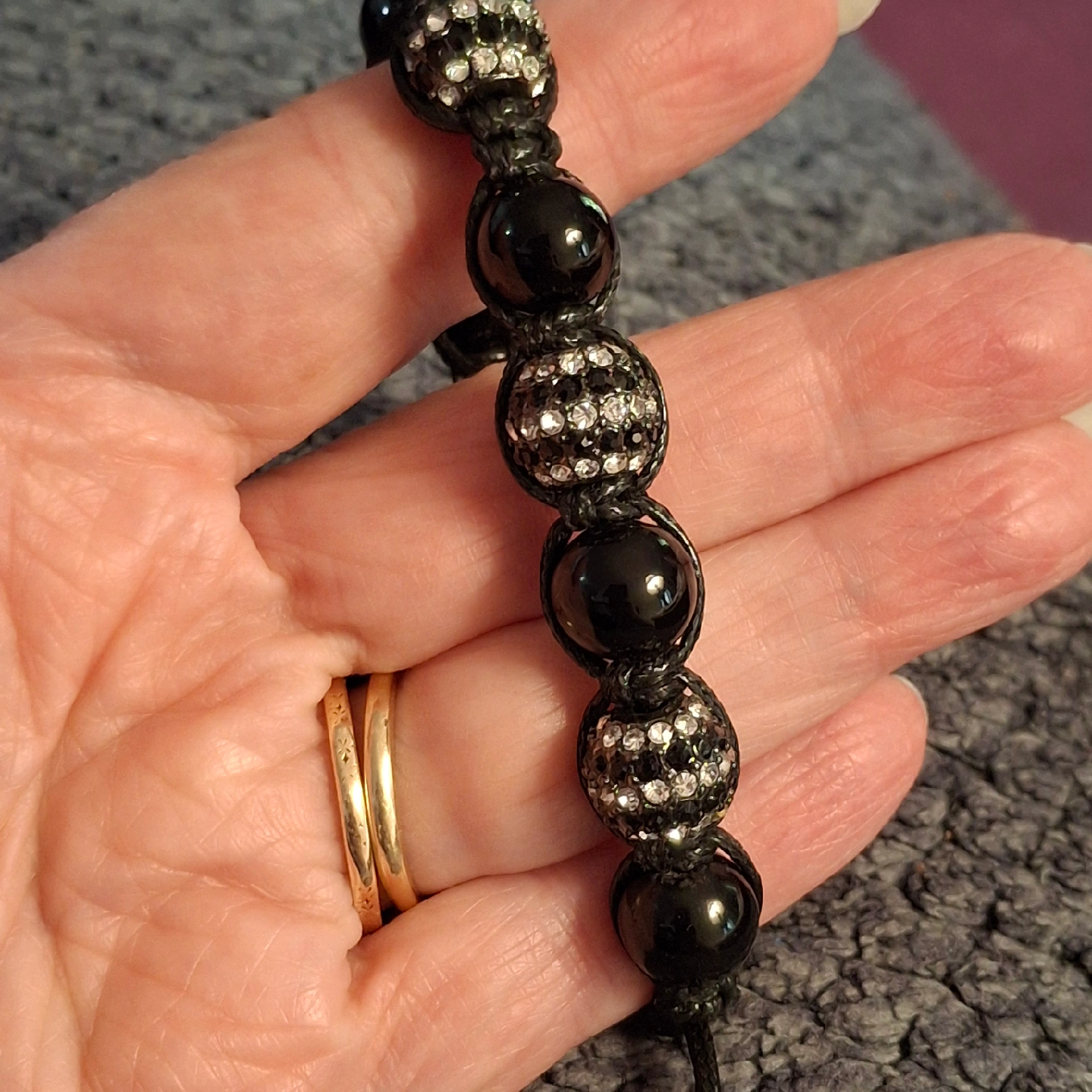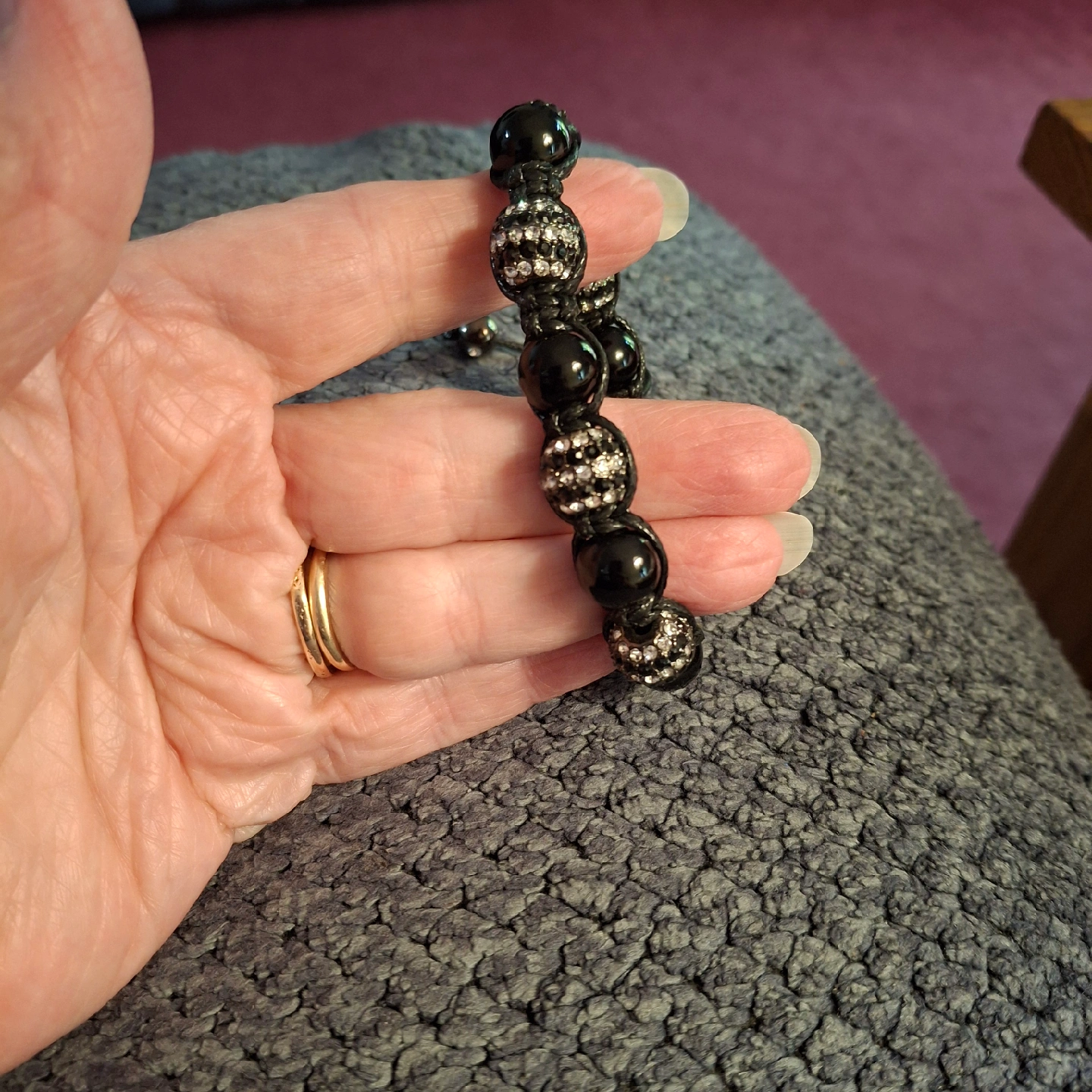 Here's a lovely beaded bracelet! It features black onyx with some sparkly rhinestone accents.