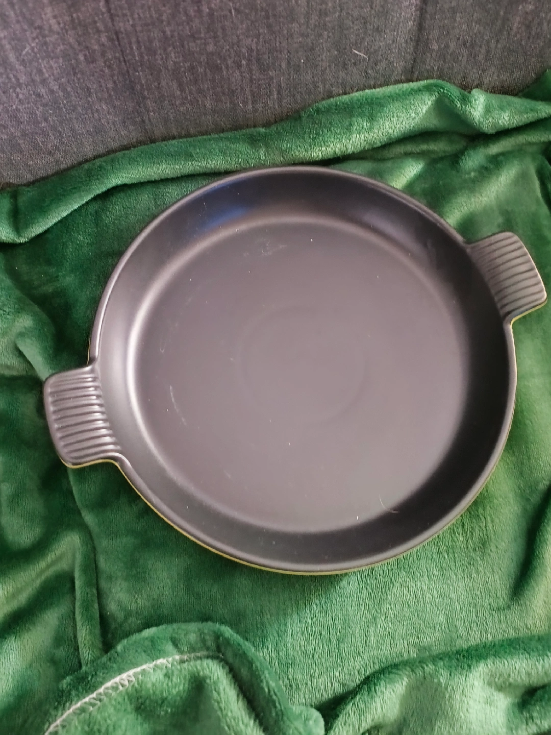 Selling a black oval serving dish with handles. It's in great condition and ready for your next dinner party! The bottom is a vibrant green colour. It measures approximately 12 inches in diameter. oven safe only