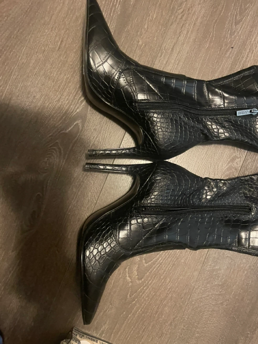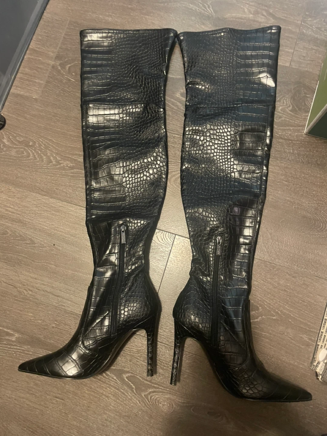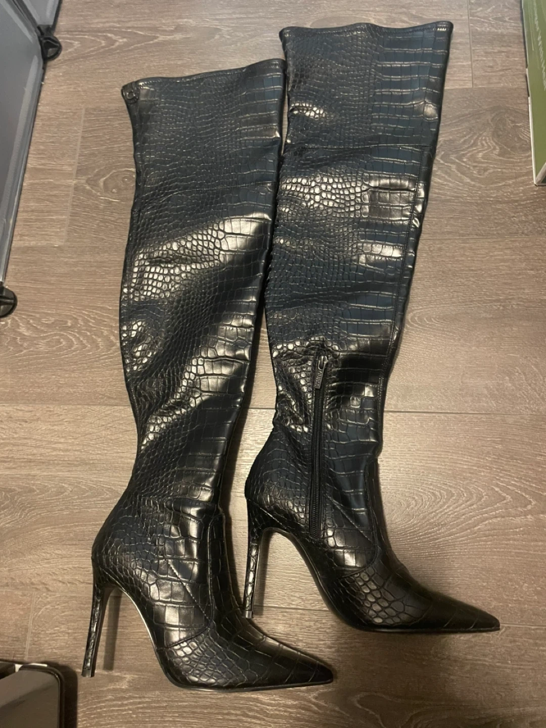 Selling a pair of stylish black over-the-knee boots. They feature a unique crocodile skin pattern and a sleek high heel. The size is 6.5M. Perfect for a night out! Cash only. Pick up only. DM if you want more info.