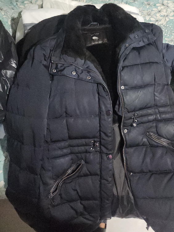 Here's a stylish black padded winter coat. It has a fur collar and some zipper details. It's in good condition and ready to keep you warm this winter!