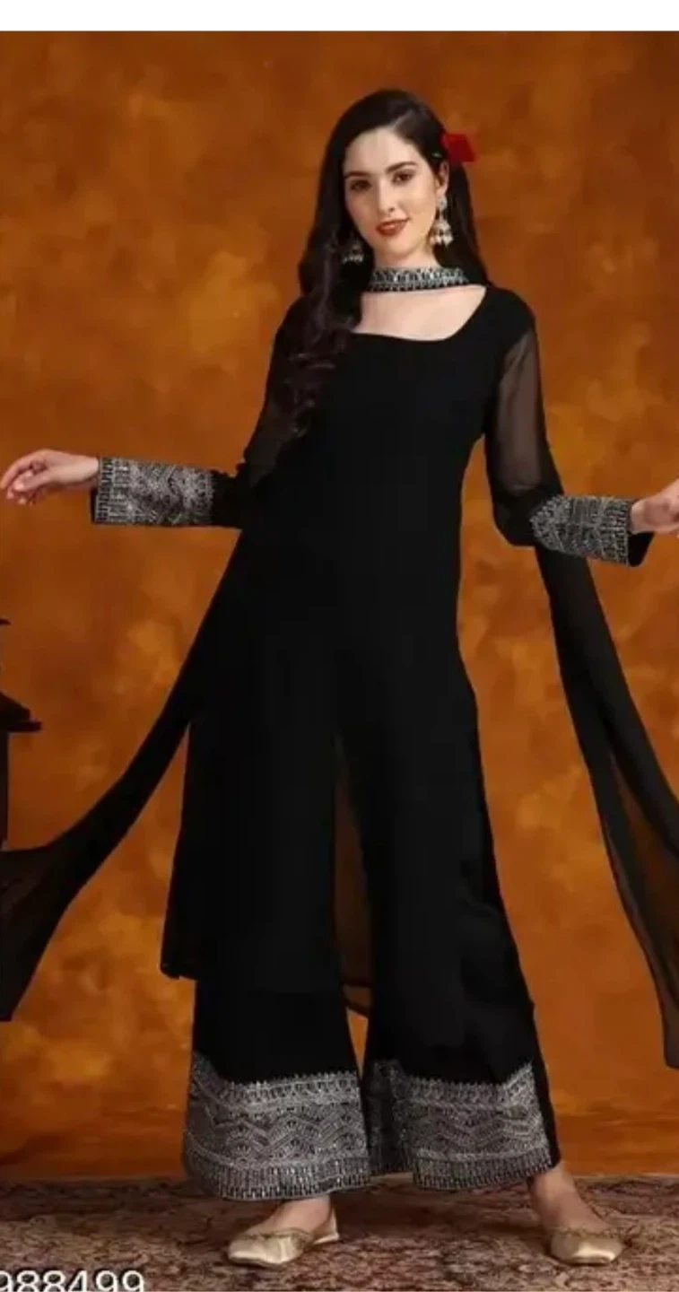This is a lovely black palazzo suit with silver detailing on the sleeves and hem. It's perfect for a special occasion or just feeling a bit fancy!