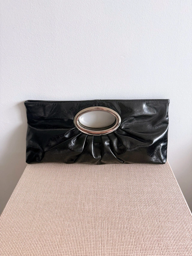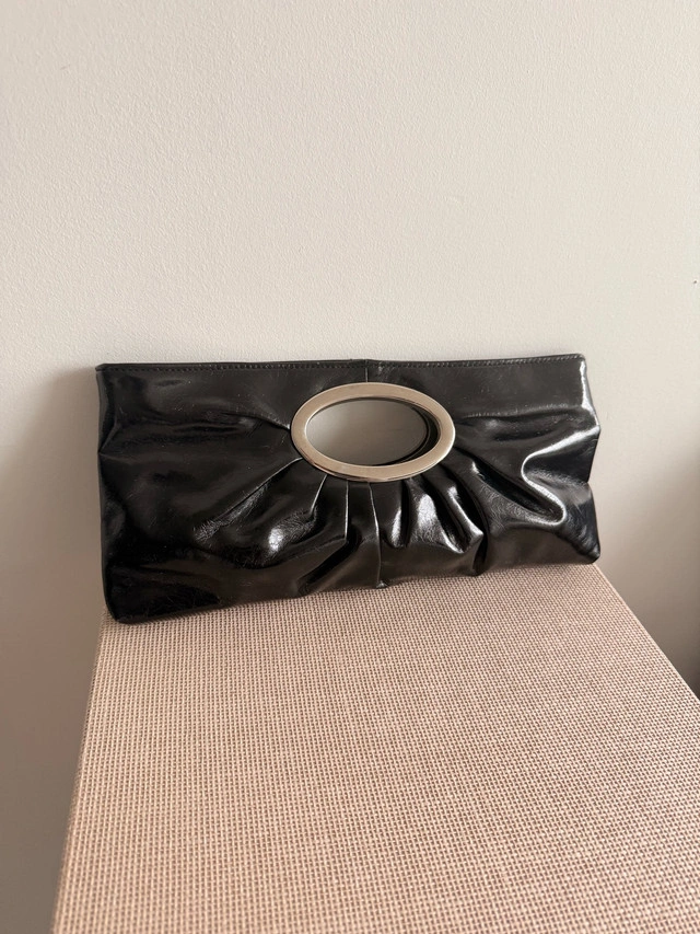 This is a chic black patent clutch with silver hardware, perfect for evenings out. The clutch is used, but in good condition. I’m selling lots of great items that need to go.