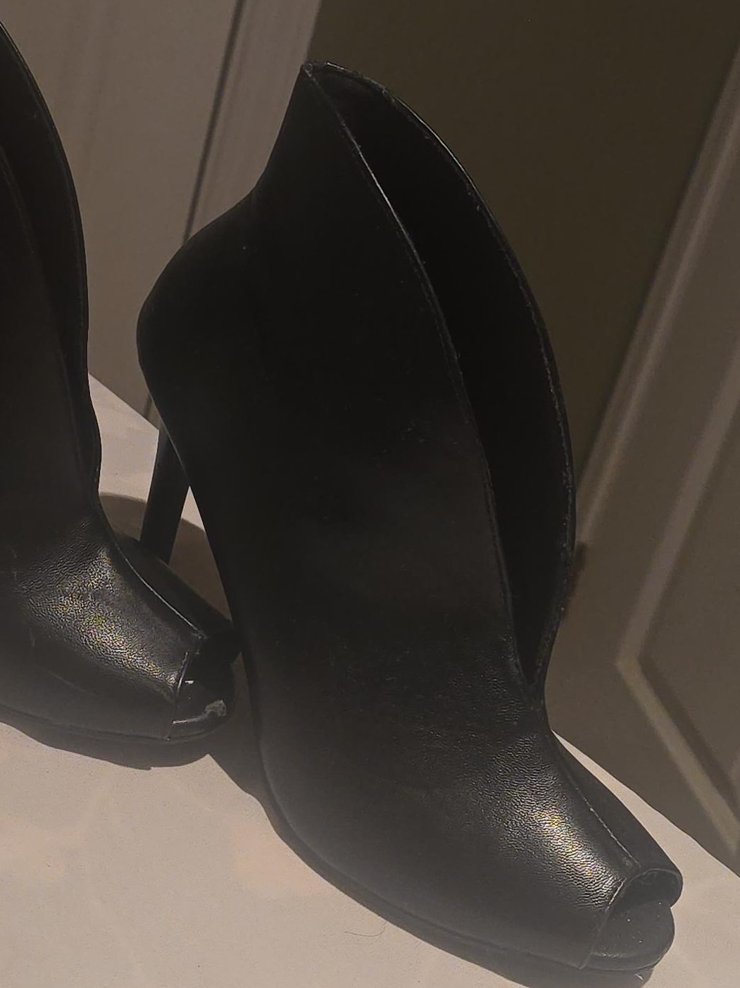 Selling a pair of black peep-toe high heel booties. They show some signs of wear, as you can see in the photos.