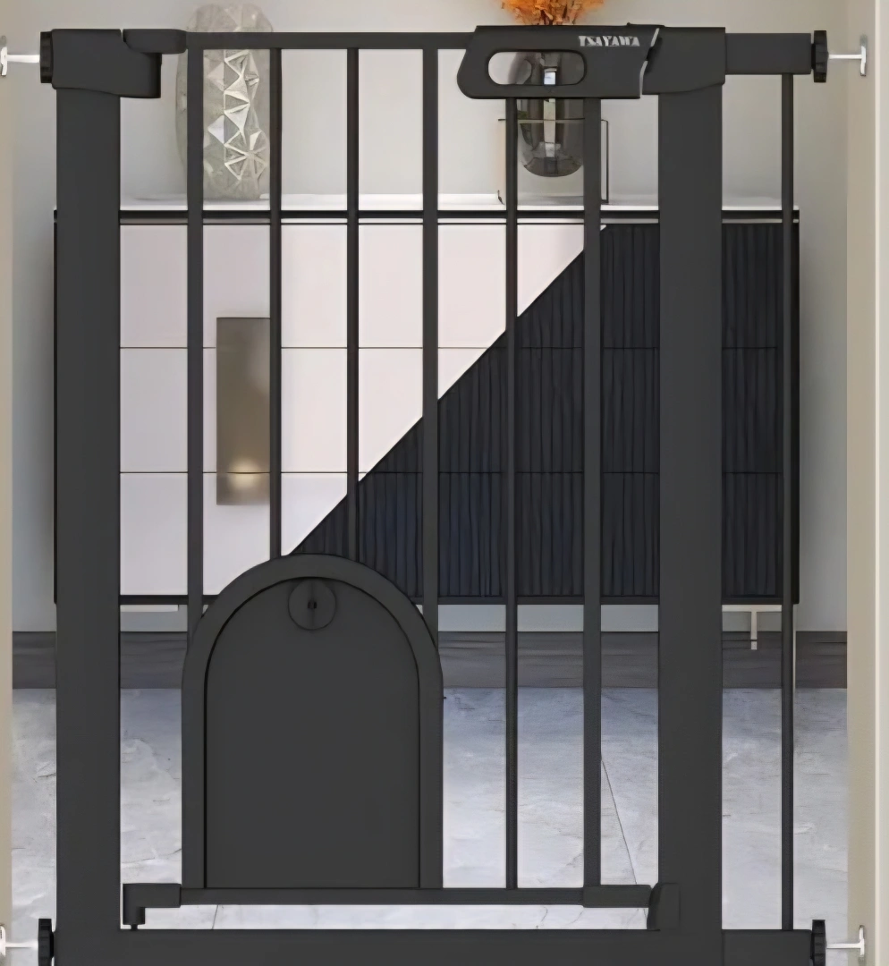 Selling a pet gate in grey. It's in great condition and features a convenient door for easy access. Perfect for keeping your furry friends safe and secure! It is adjustable.