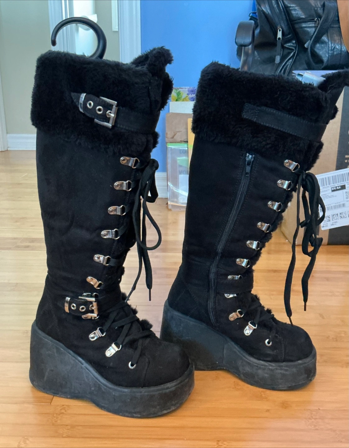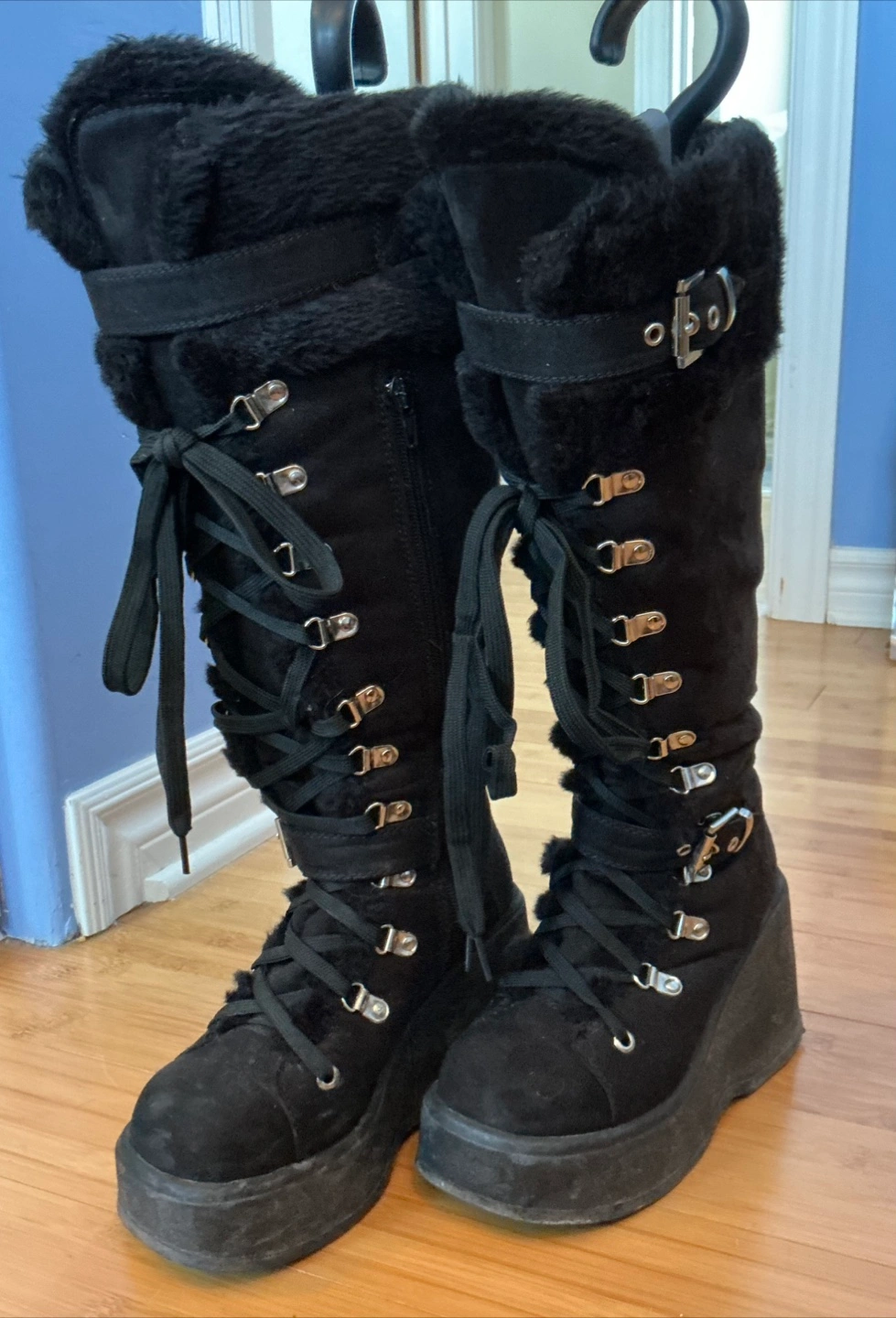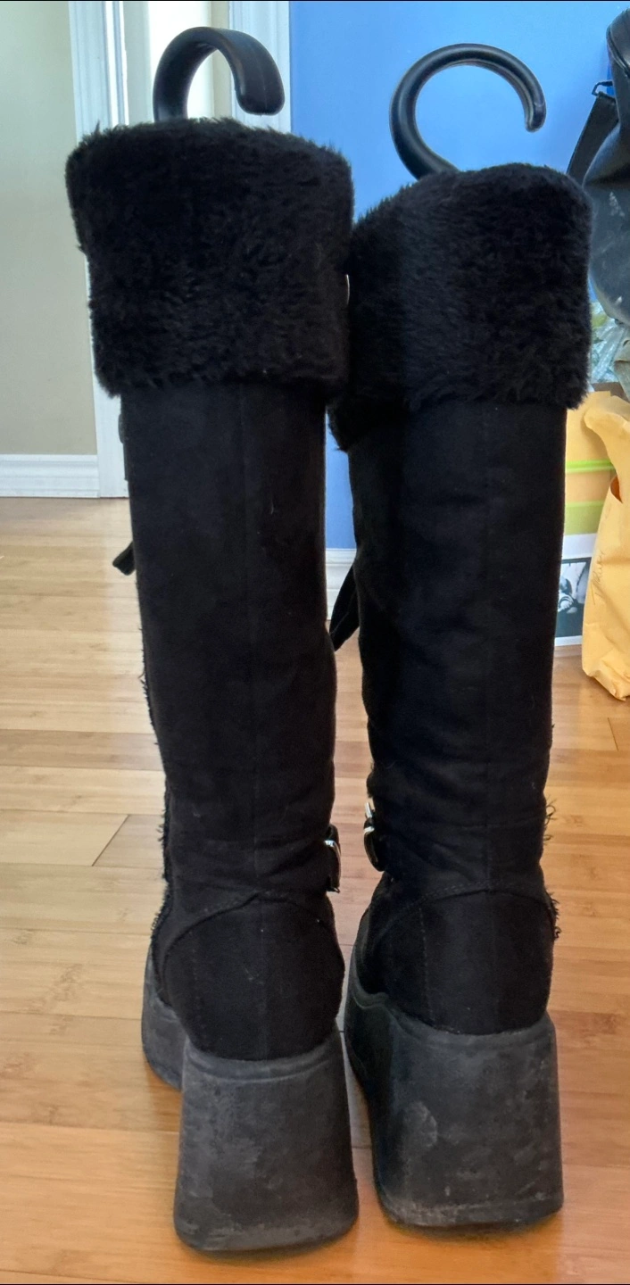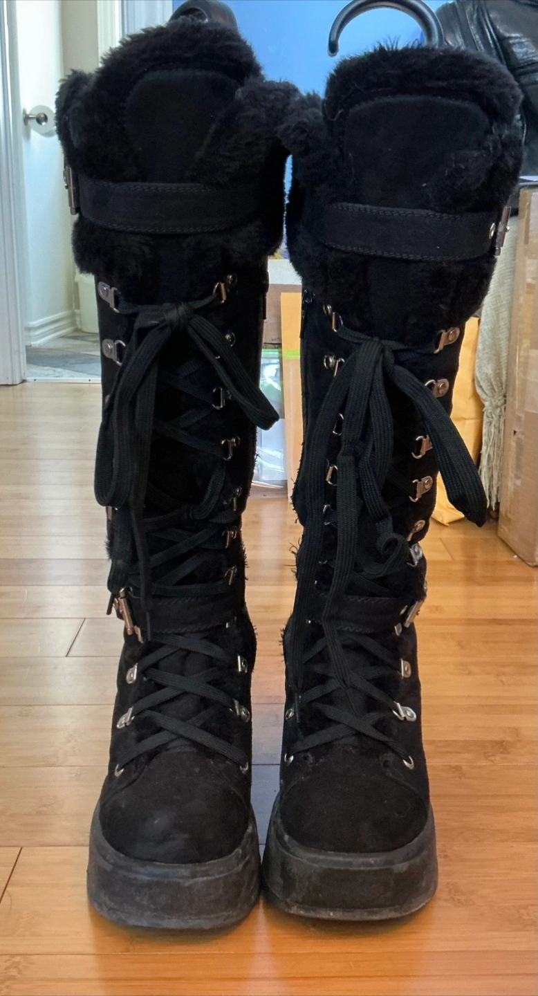These black platform knee-high boots are super stylish! They feature a faux fur trim, lace-up detailing, and buckle accents. They're in good condition and ready for a new home! Don’t worry about lacing up every time there’s a cheater zipper at the side. You’ll get lots of compliments with these lookers, I know I did! They’re warm too! Winner, winner!!!