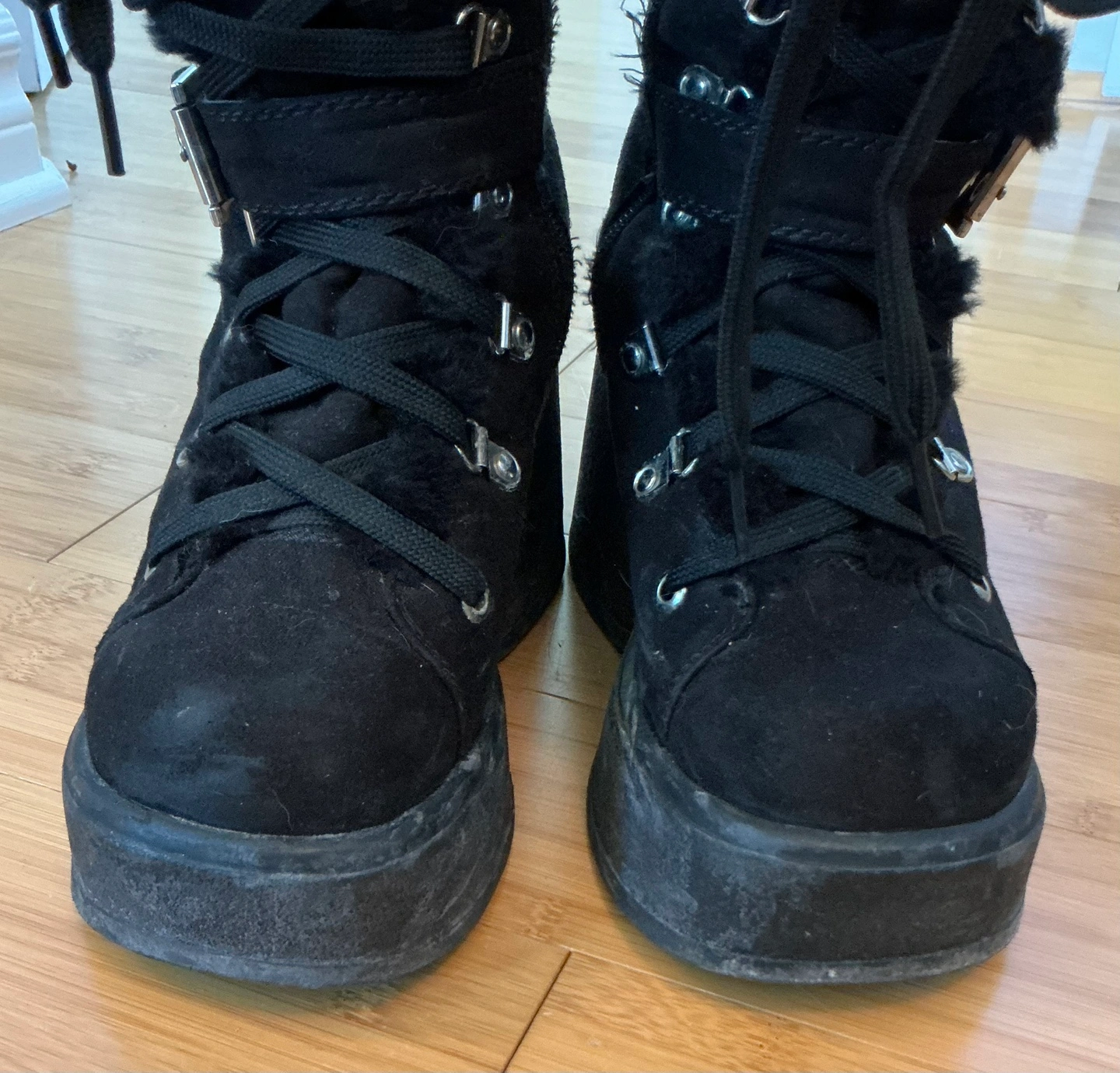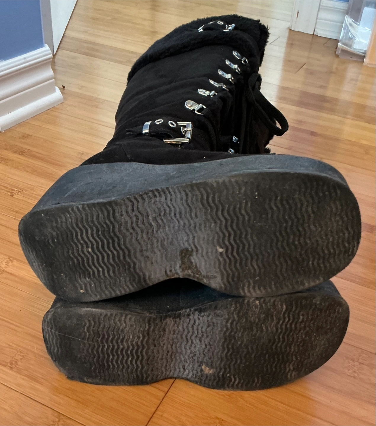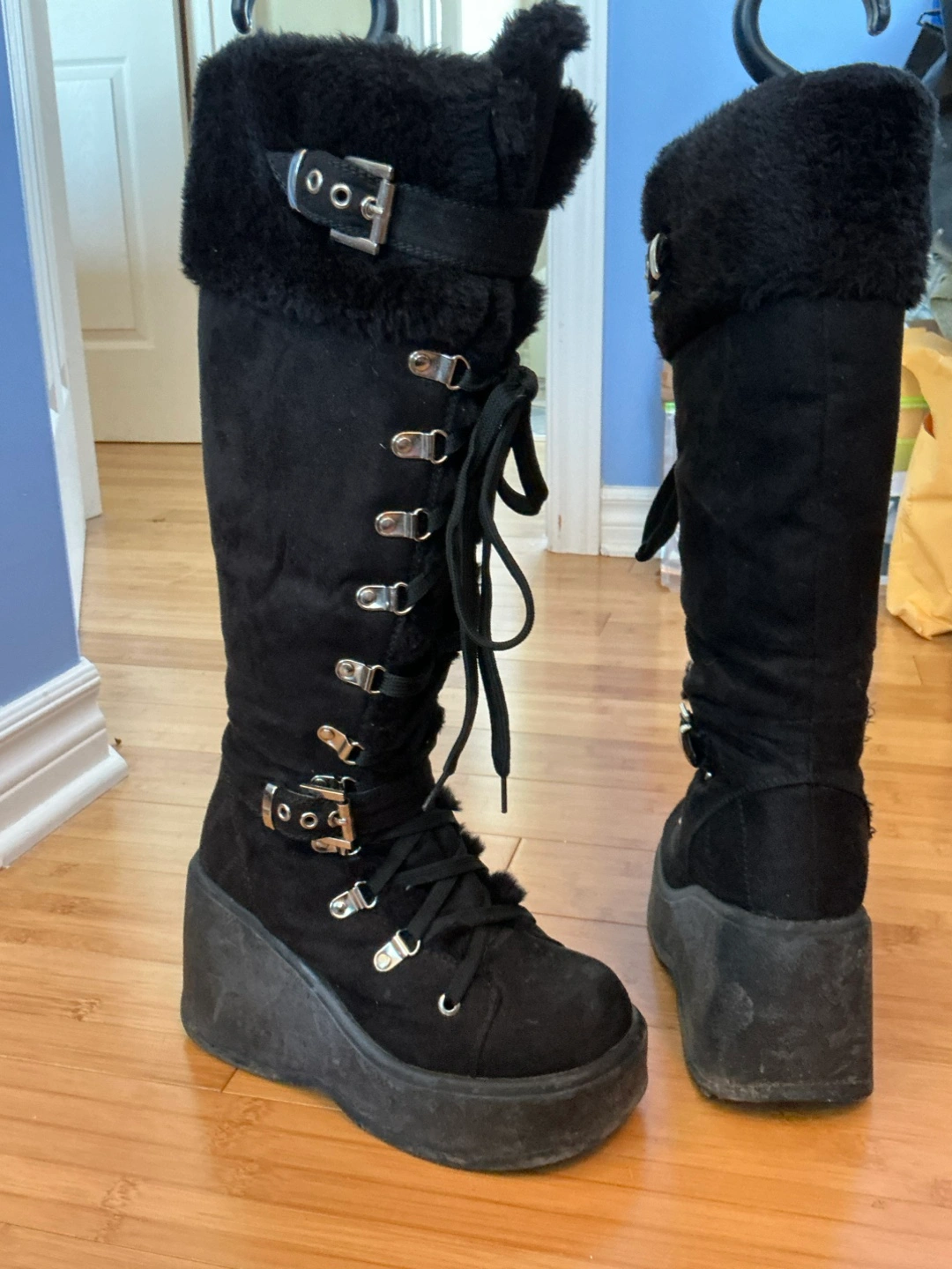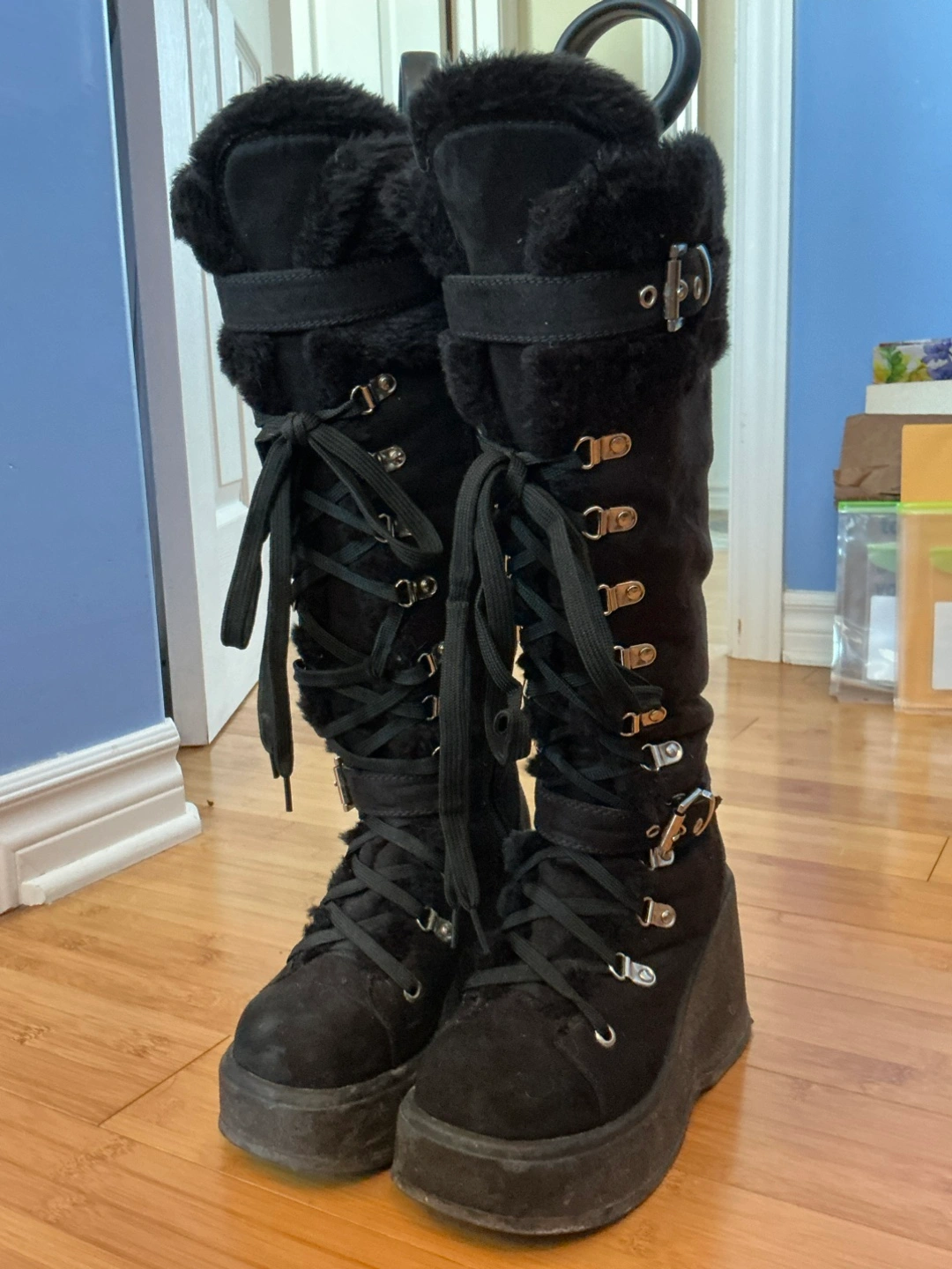 These black platform knee-high boots are super stylish! They feature a faux fur trim, lace-up detailing, and buckle accents. They're in good condition and ready for a new home! Don’t worry about lacing up every time there’s a cheater zipper at the side. You’ll get lots of compliments with these lookers, I know I did! They’re warm too! Winner, winner!!!