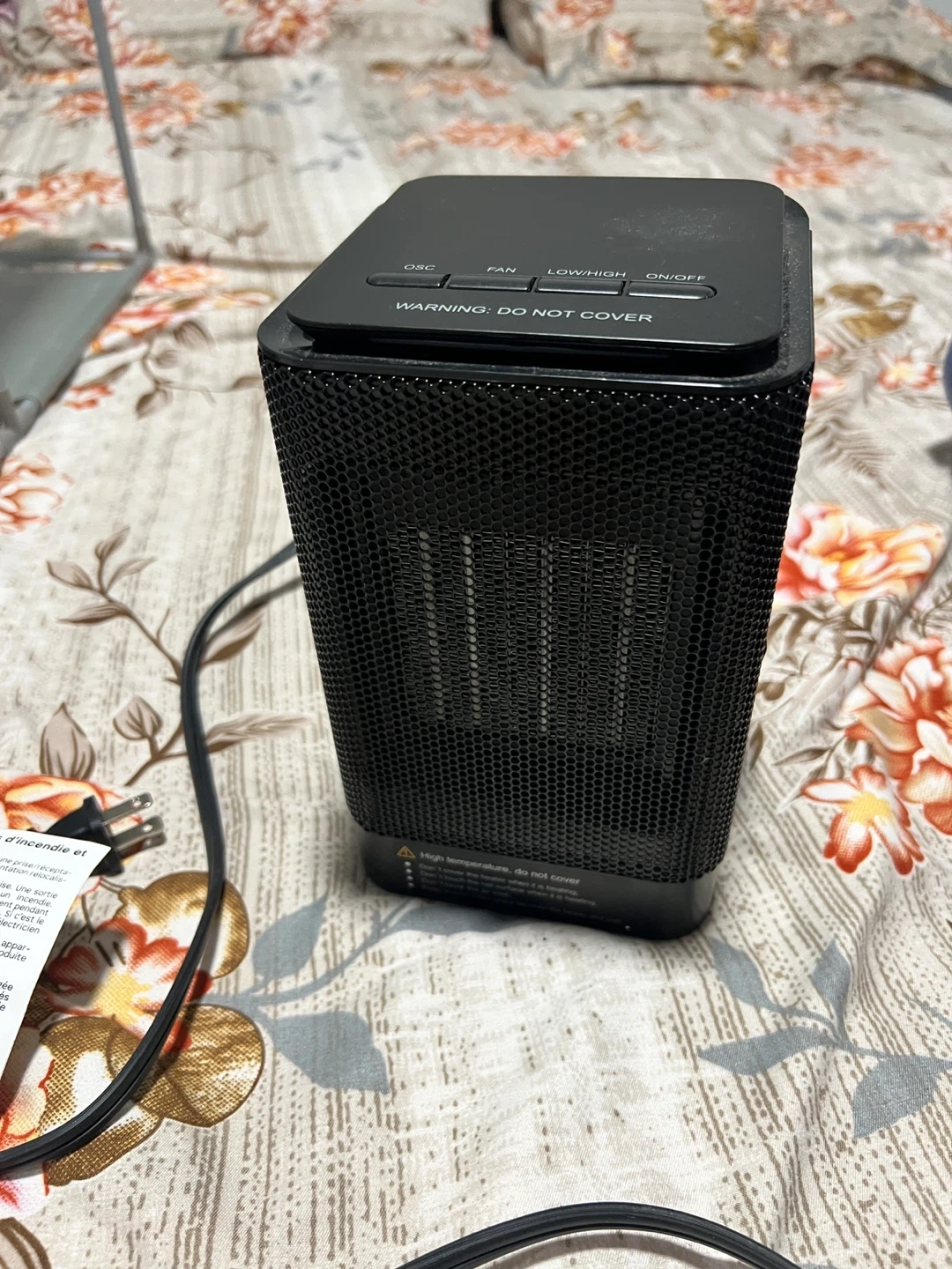 I'm selling a black portable space heater. It has an OSC function, and fan with low/high settings. It also has an on/off switch. Perfect for keeping warm during the cold months!