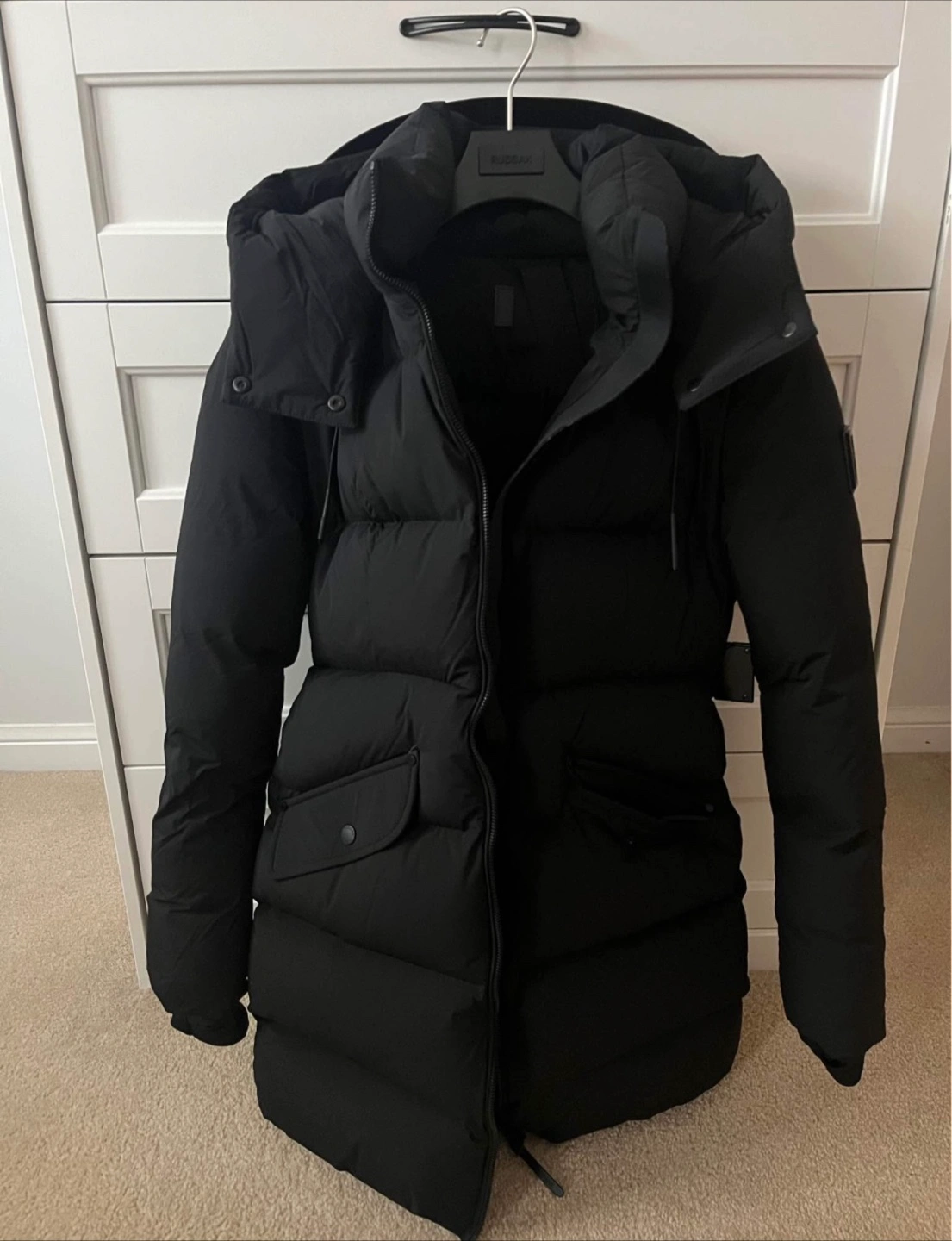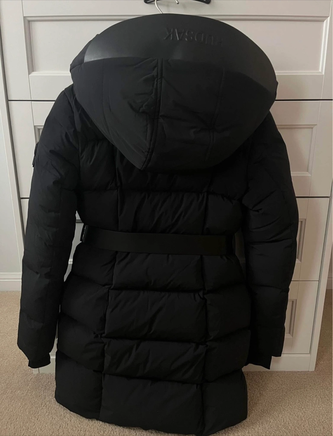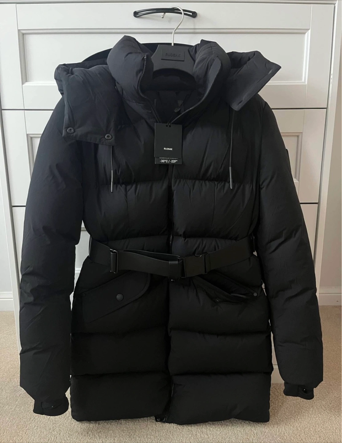 A black puffer jacket. Features a hood, pockets, and a detachable belt.