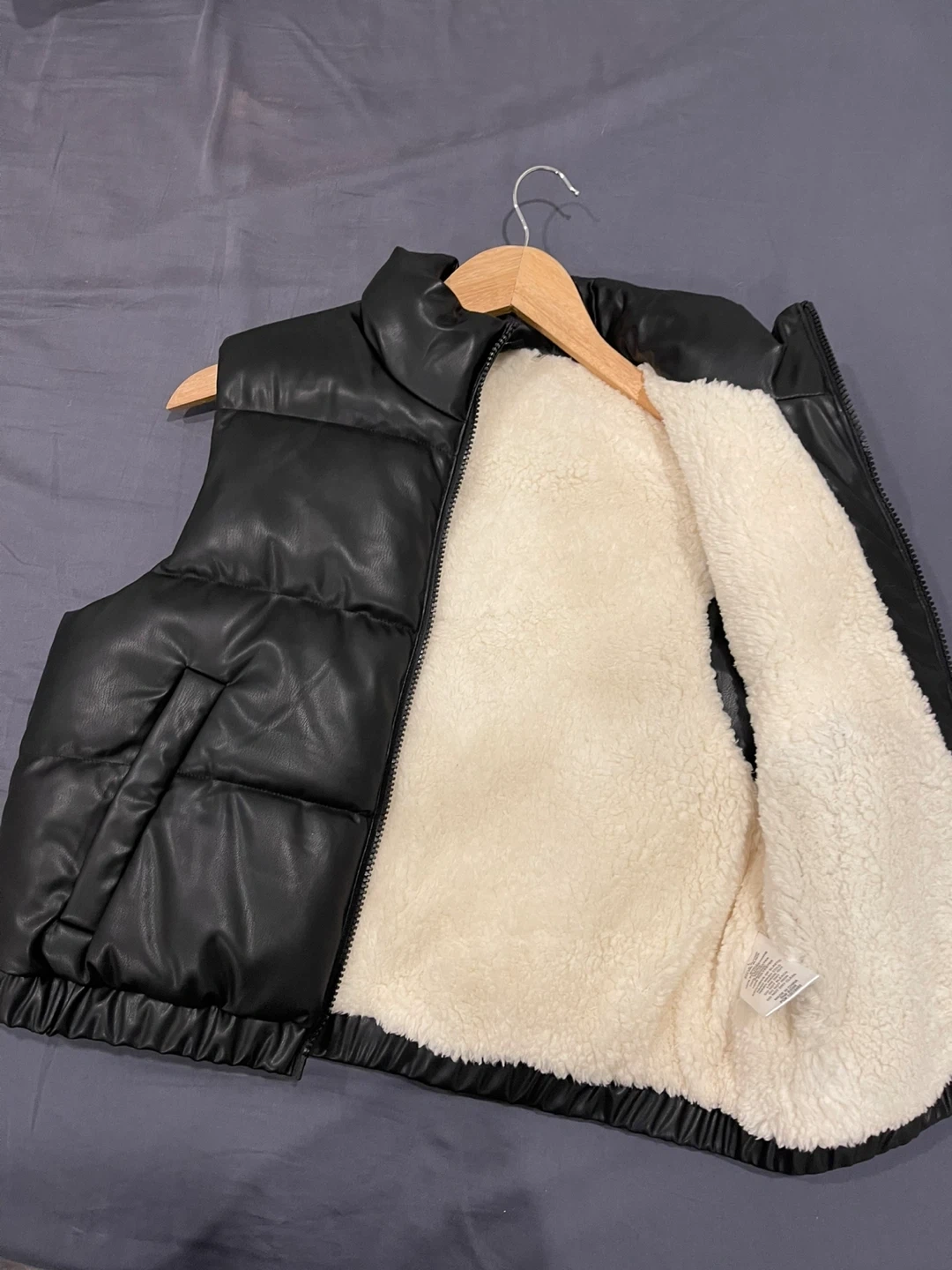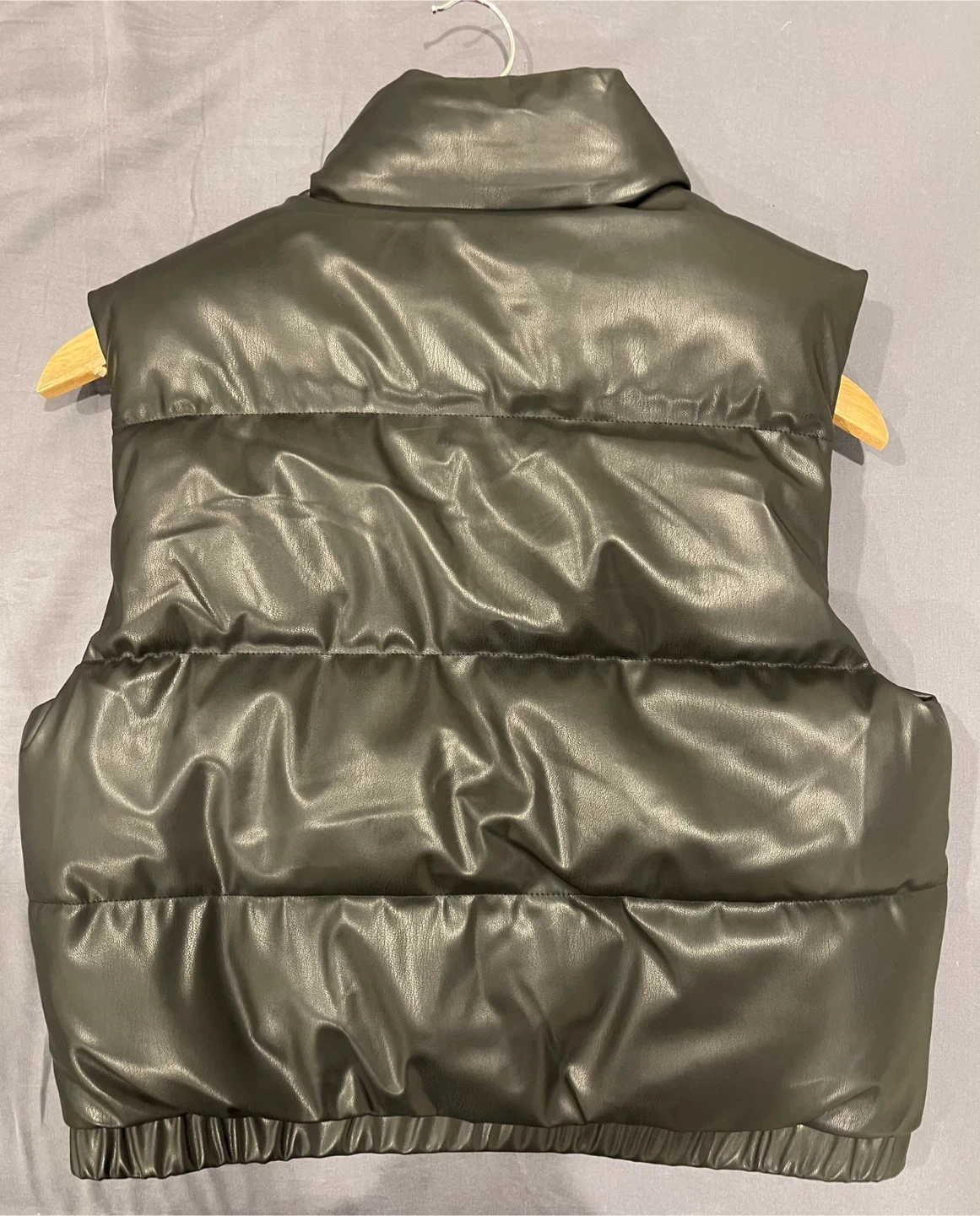 Selling a black puffer vest in size large for kids The vest has a polyurethane shell, polyester lining and padding. Perfect for layering during the cooler months!