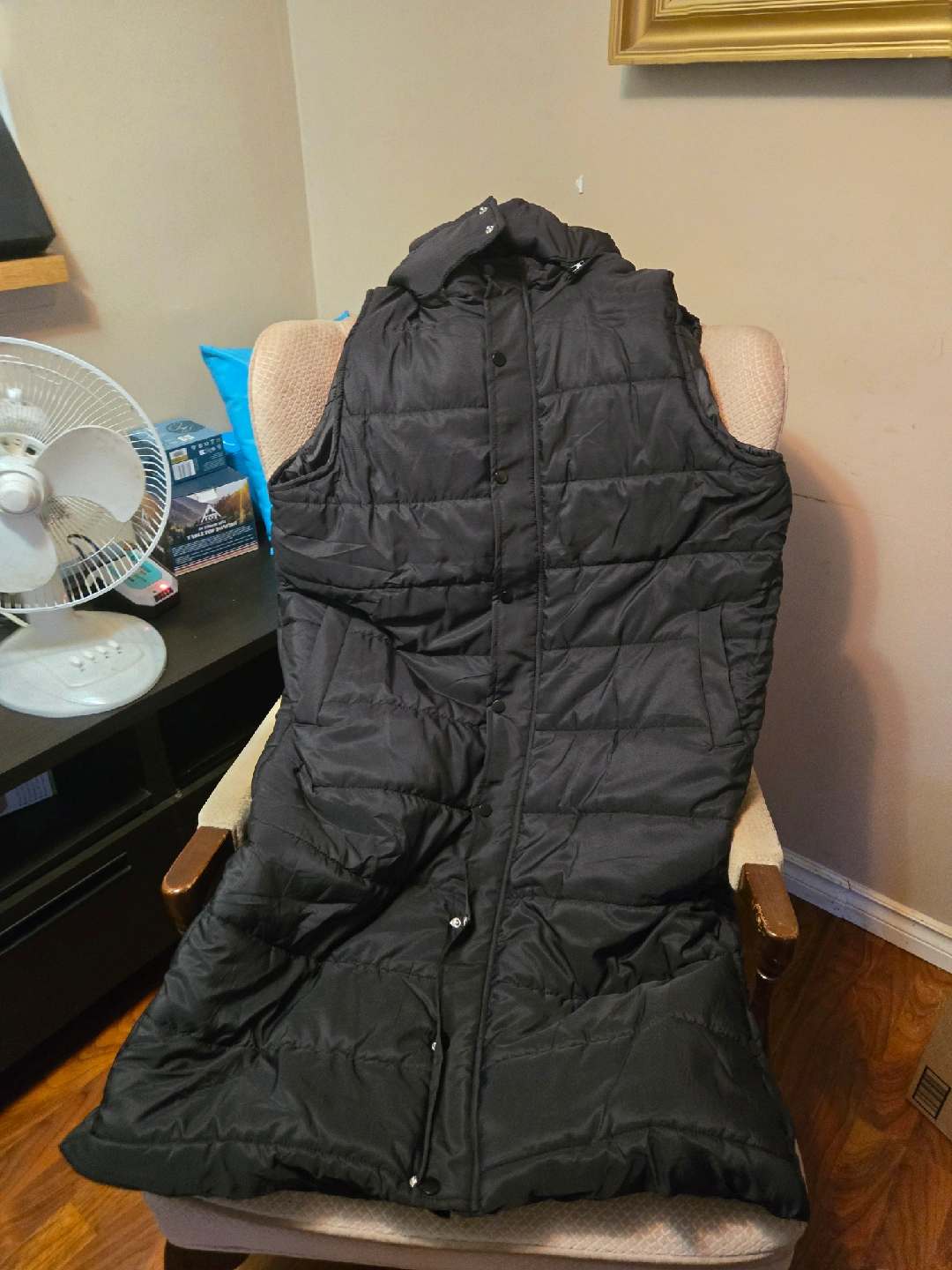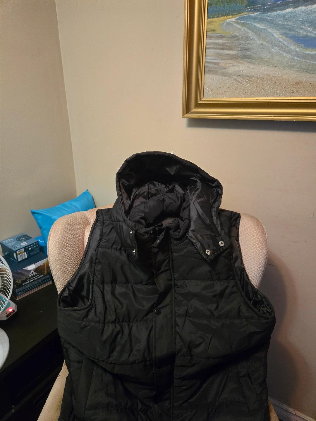 Selling a black puffer vest with a hood. It's in great condition and perfect for layering during those cooler days. It's a stylish and practical addition to any wardrobe!