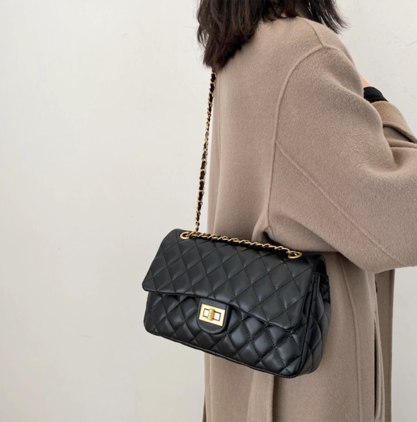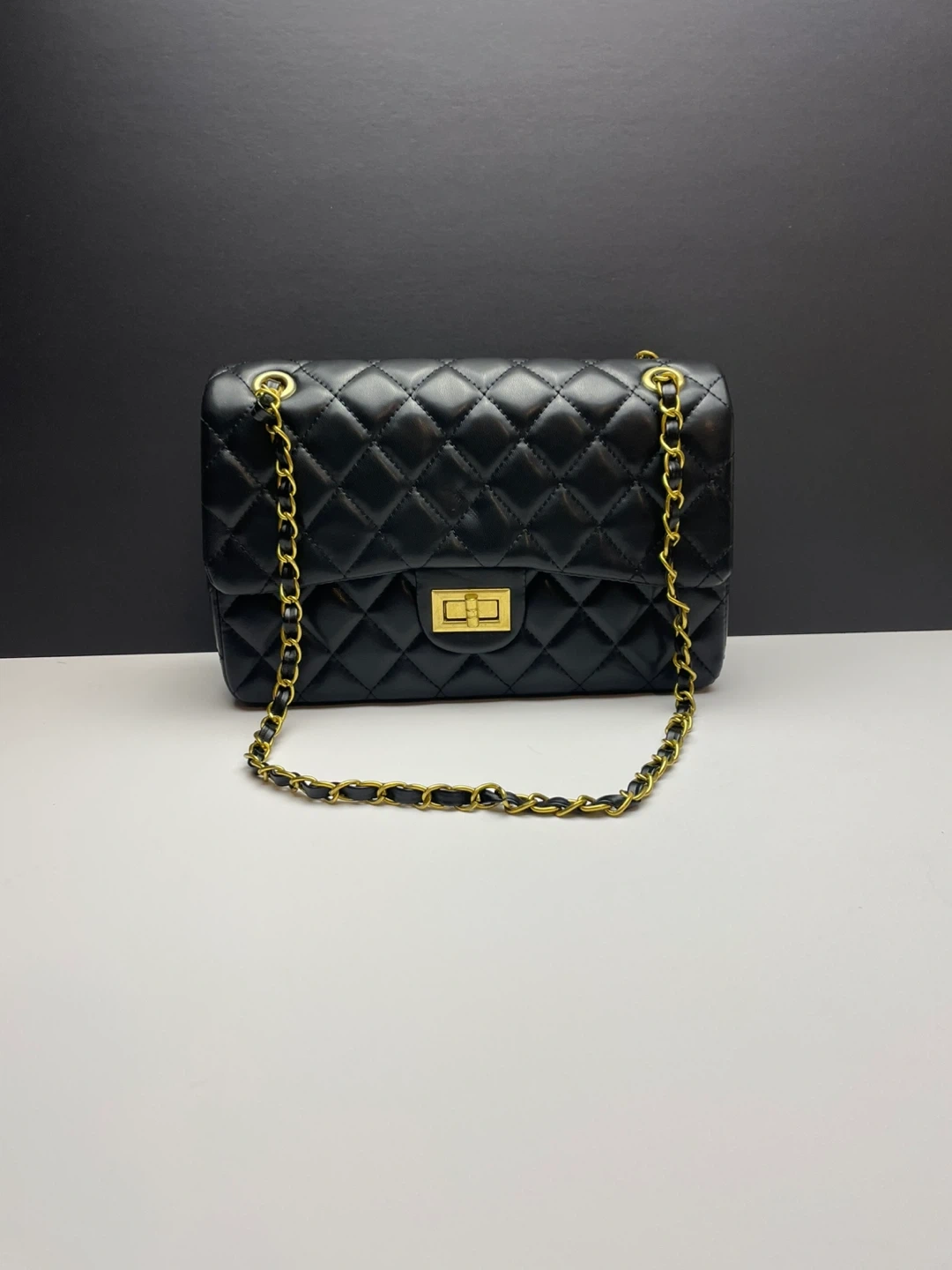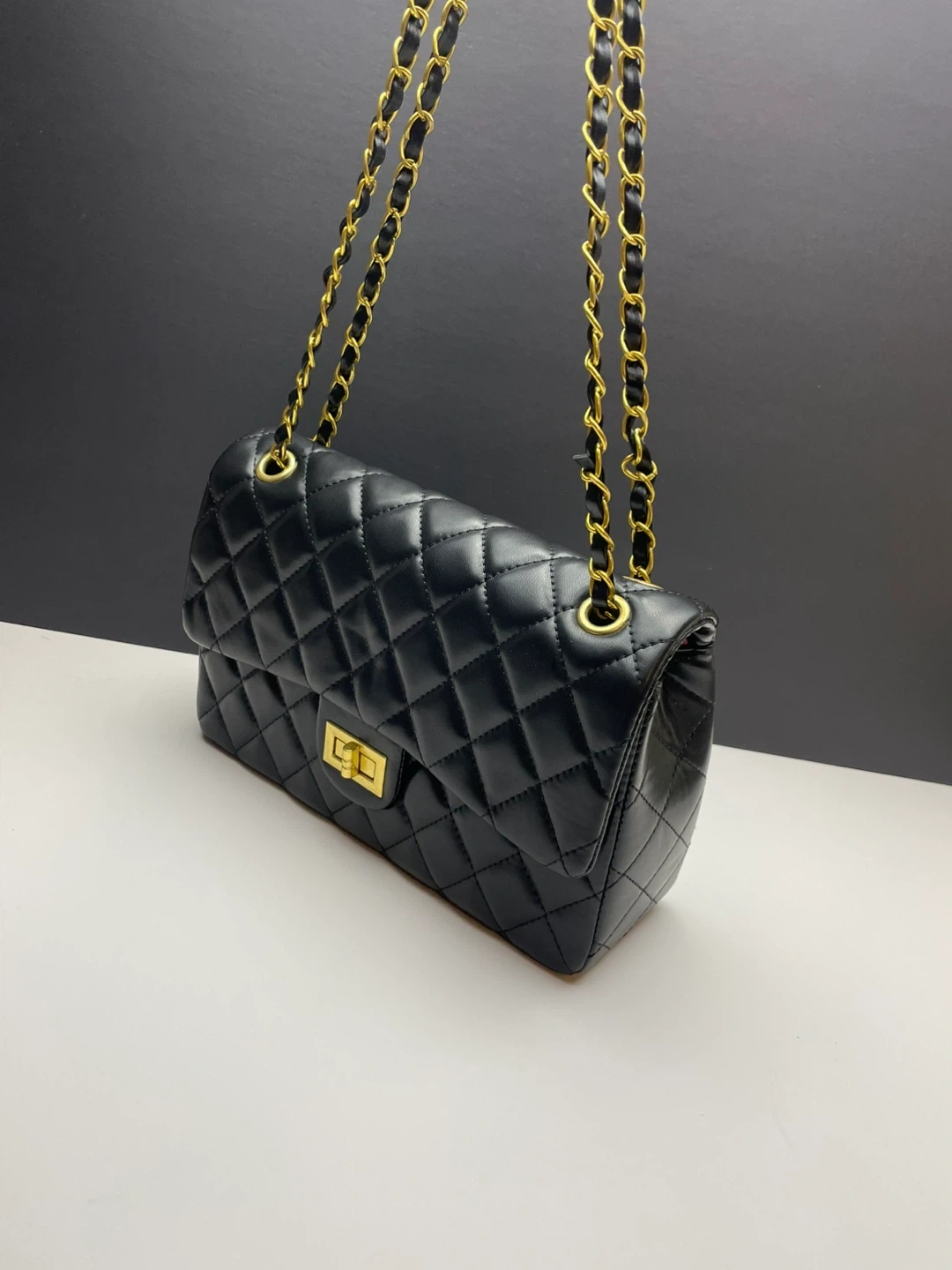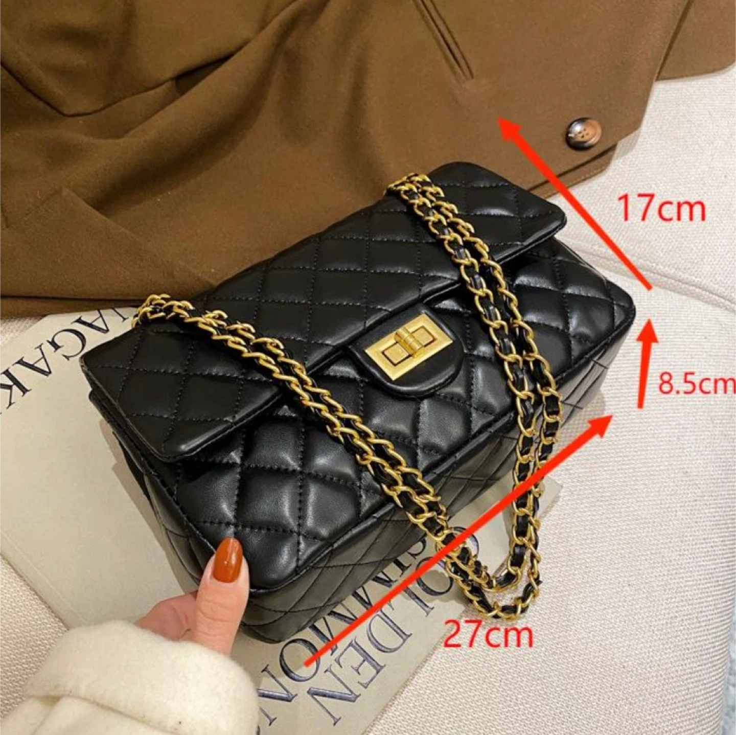 Stylish black quilted shoulder bag featuring a gold chain strap. The bag is in great condition and perfect for adding a touch of elegance to any outfit. The dimensions are approximately 27cm x 17cm x 8.5cm