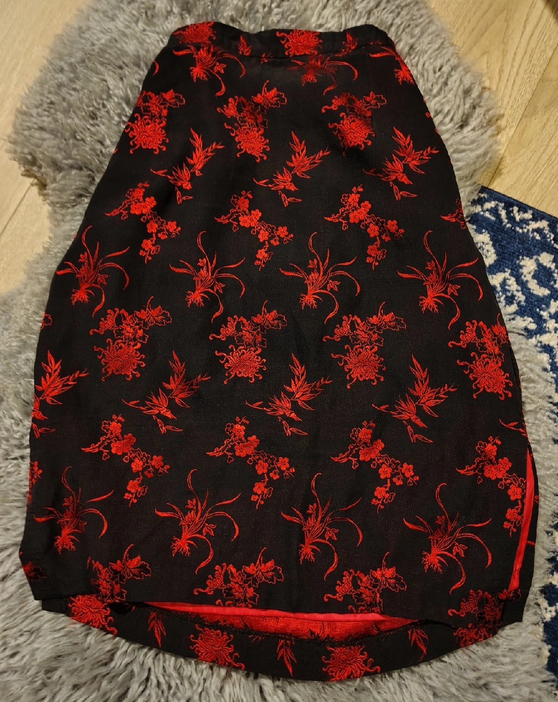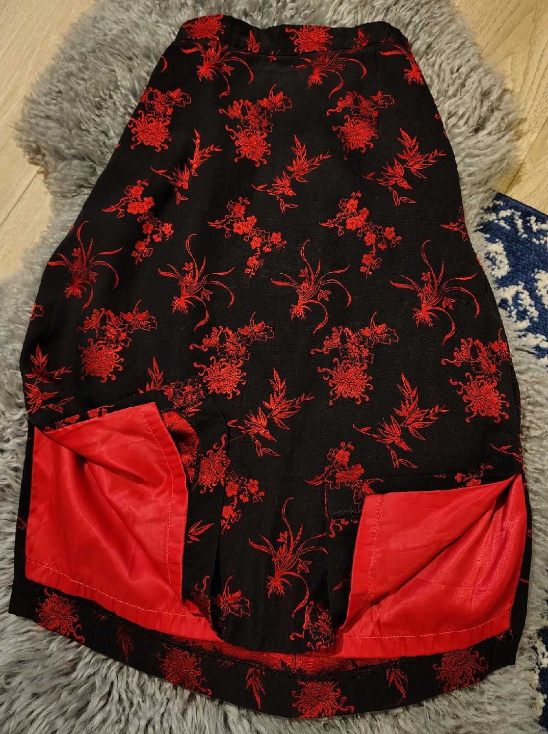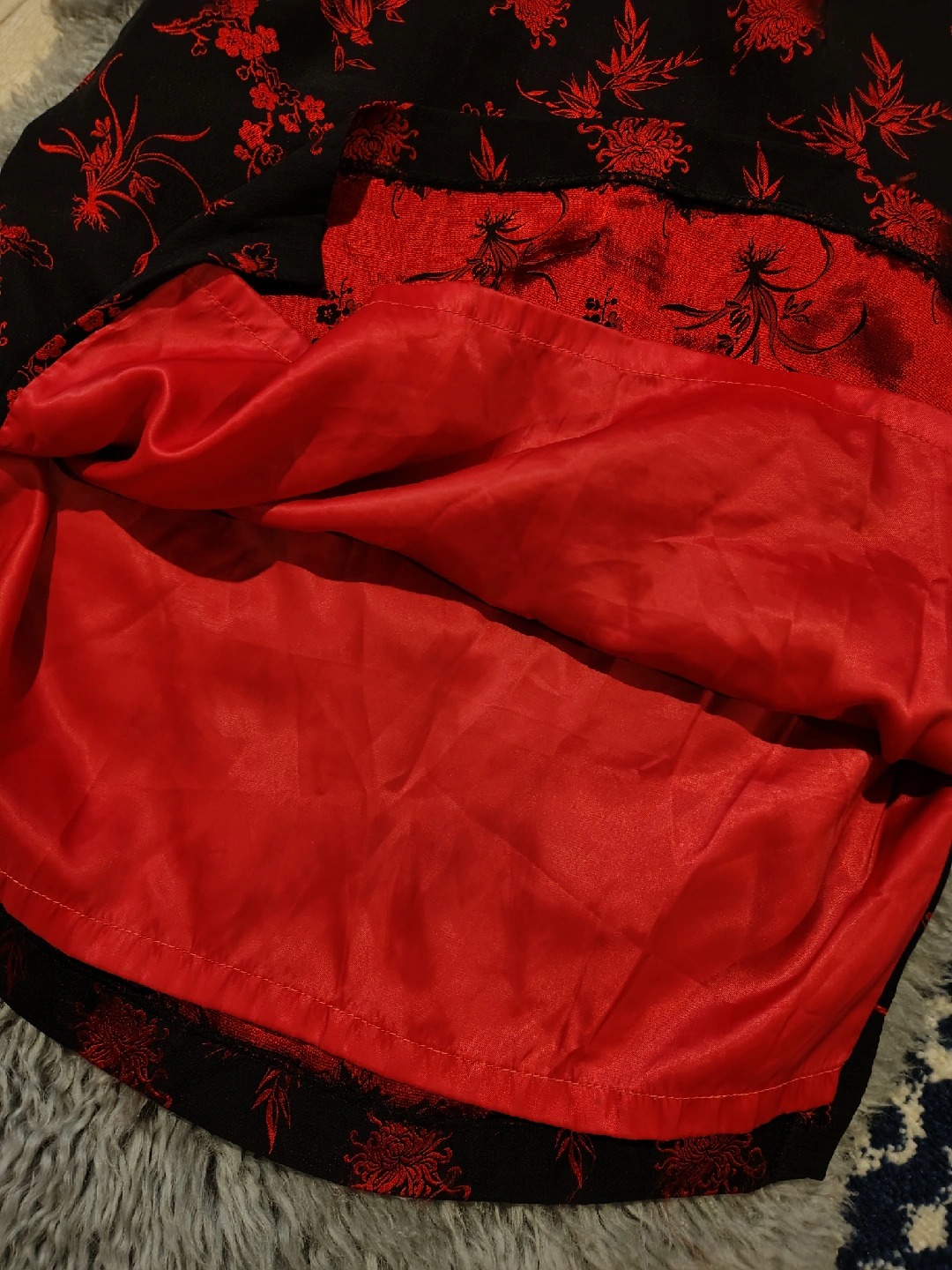 Selling a skirt with a black and red floral design. It has a red lining and a zipper at the back. It's in great condition! Classic vintage pencil skirt with slits on the side for easy walking, size xs-s. retro gothic vibe!