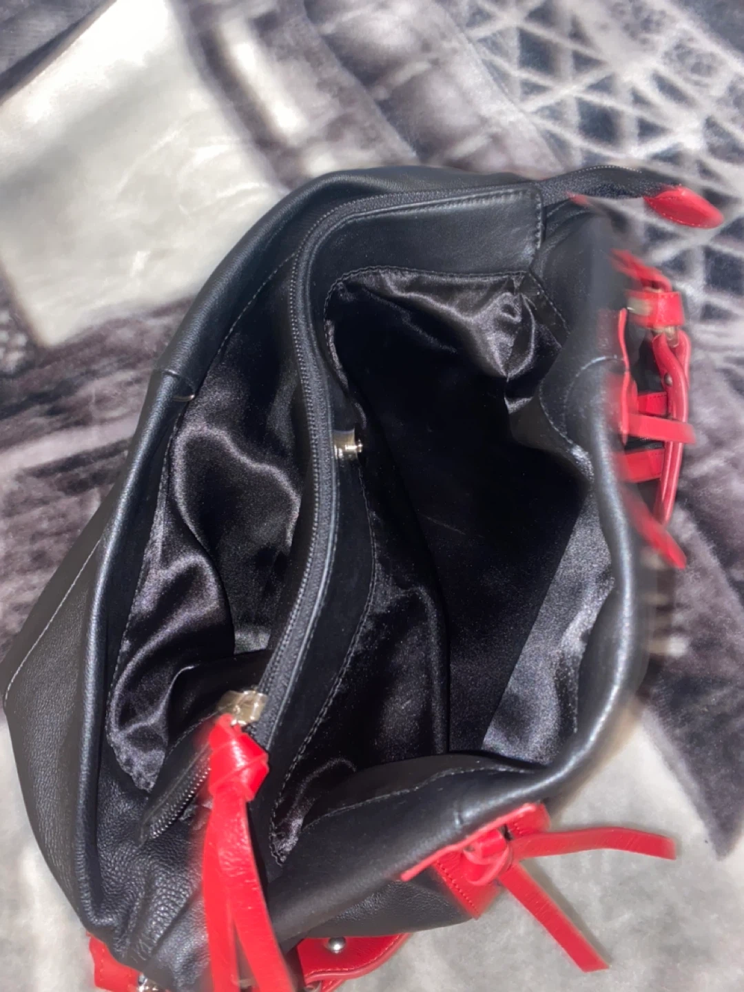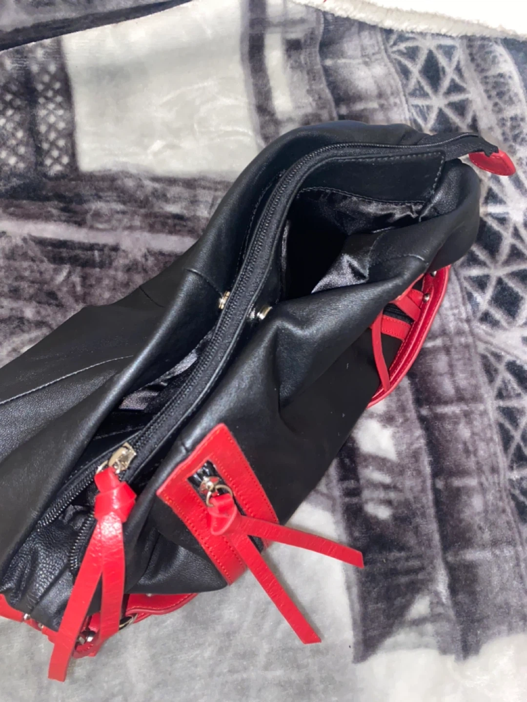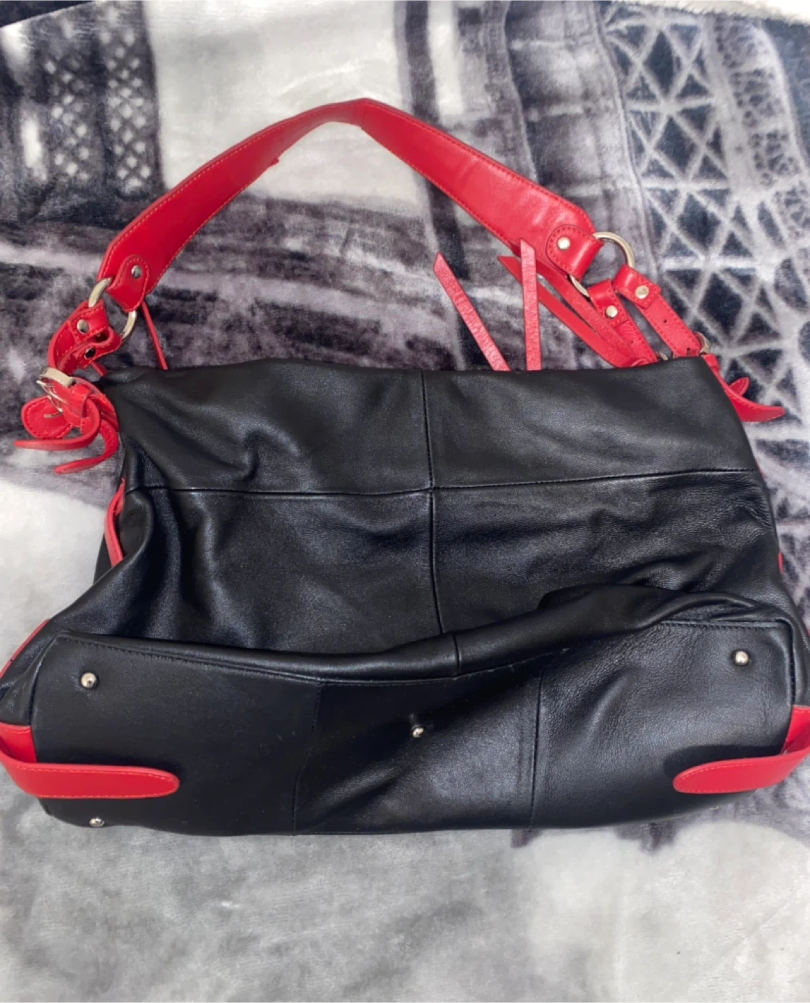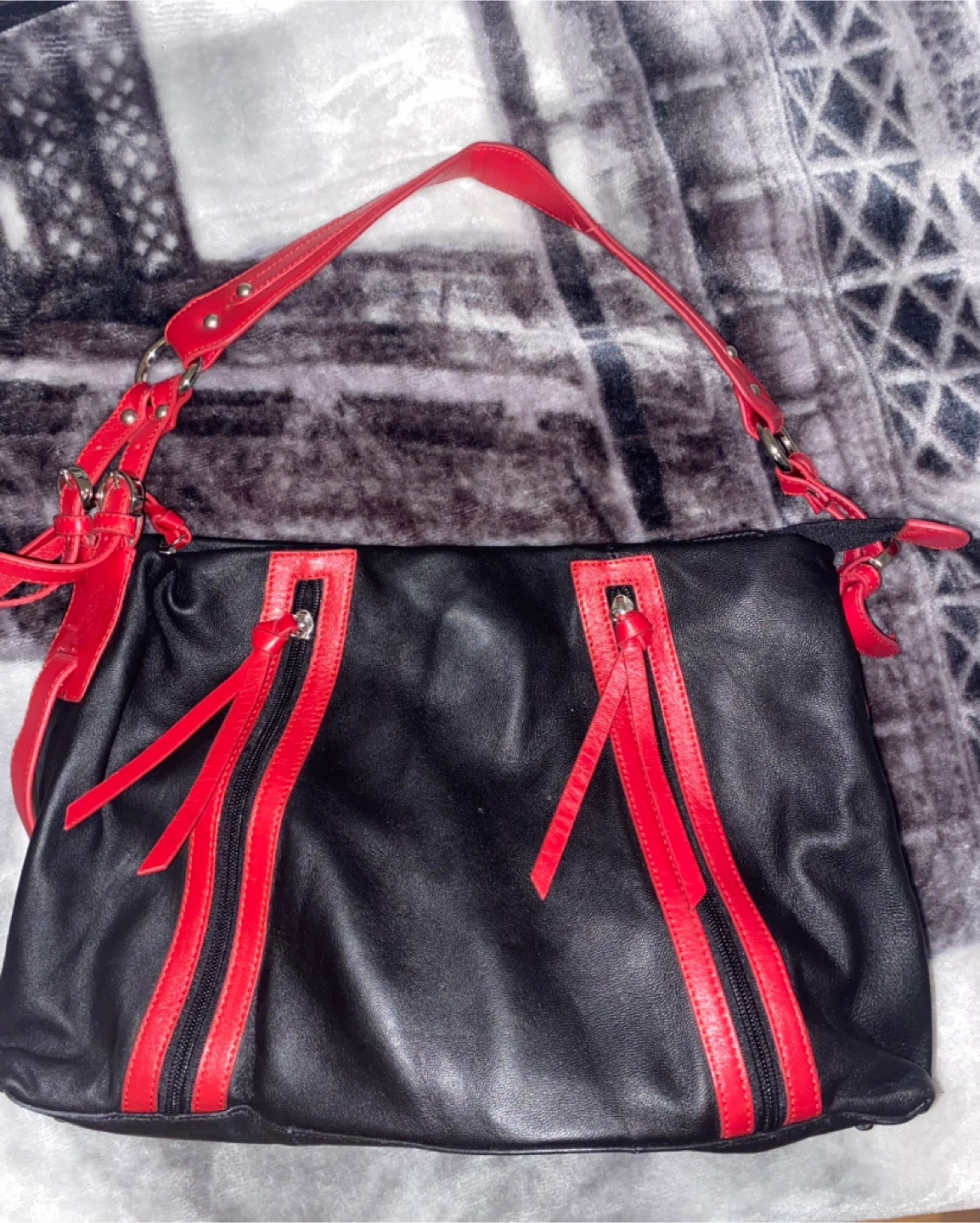 Selling a black leather shoulder bag with vibrant red accents! It's in great condition and features a spacious interior with a zippered pocket