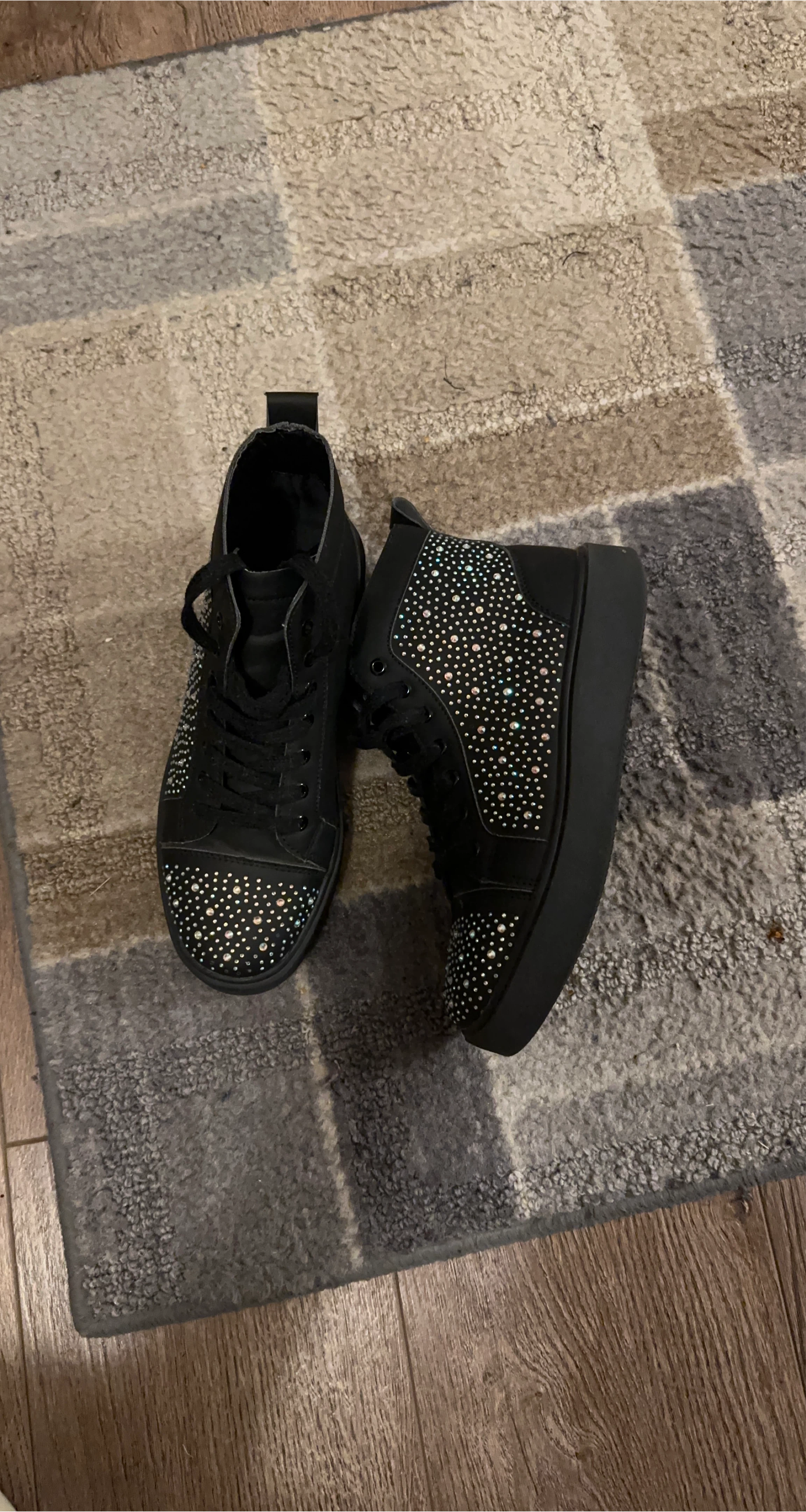 Selling a pair of black high-top sneakers with rhinestone detailing. They're in good condition, perfect for adding a bit of sparkle to your outfit!
