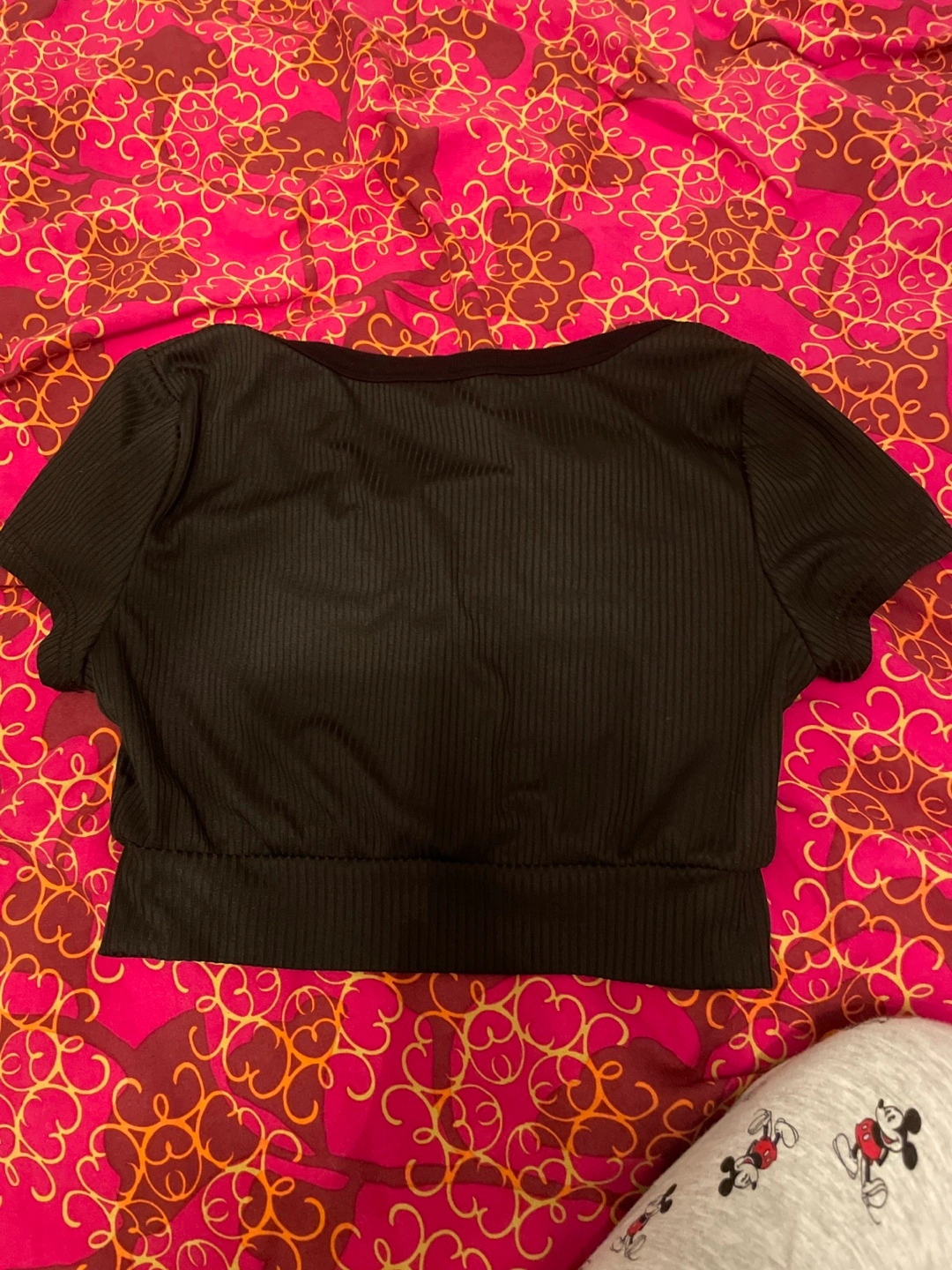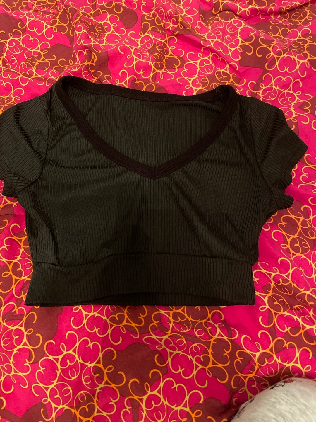 Selling a cute black ribbed crop top! It's in great condition and perfect for summer. The material is soft and stretchy, making it super comfy. It has a v-neck design that's really flattering. Feel free to message me with any questions!
