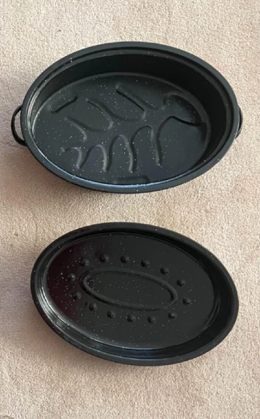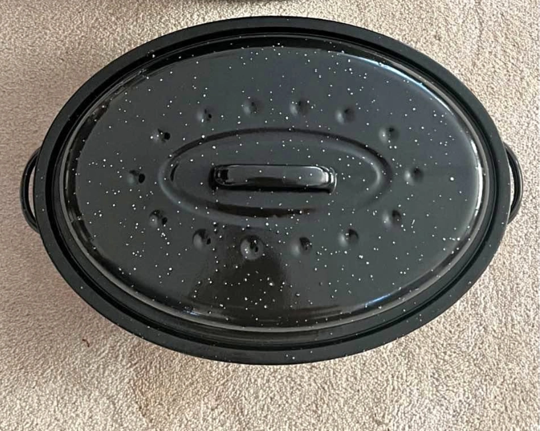 Selling a black roasting pan with a lid. Brand New and ready for your next roast! The pan is oval shaped and has handles on the side for easy carrying