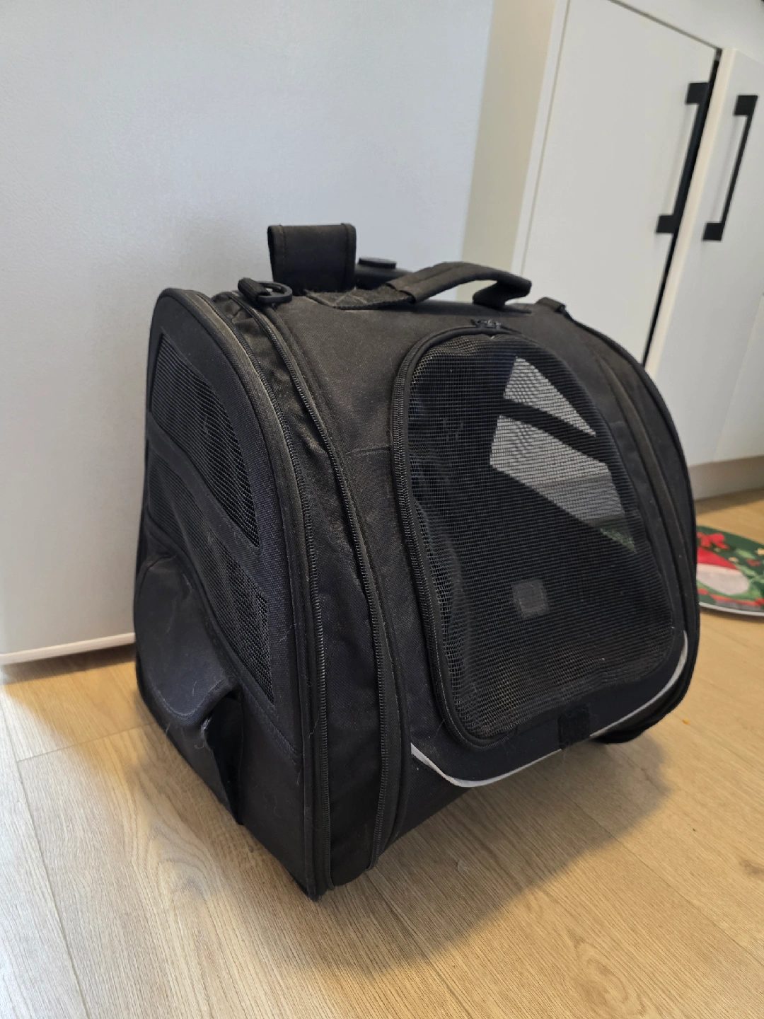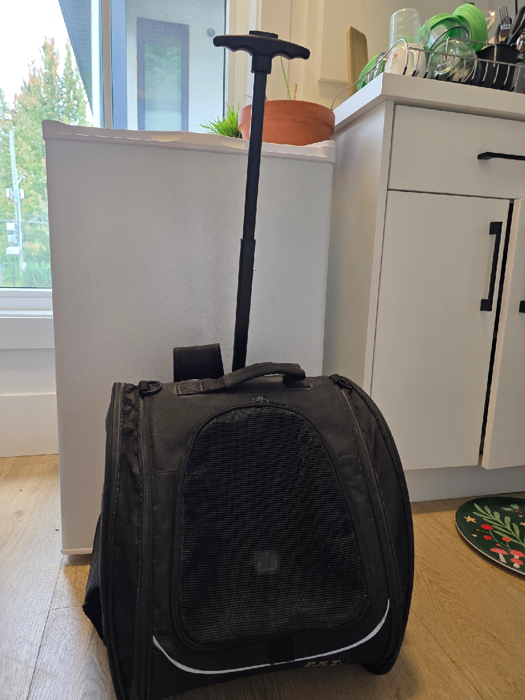 FREE. This rolling carrier is perfect for taking your furry friend on the go! Ready for new adventures. It features 3 mesh window for ventilation, 2 side pockets, and a telescoping handle for easy transport.