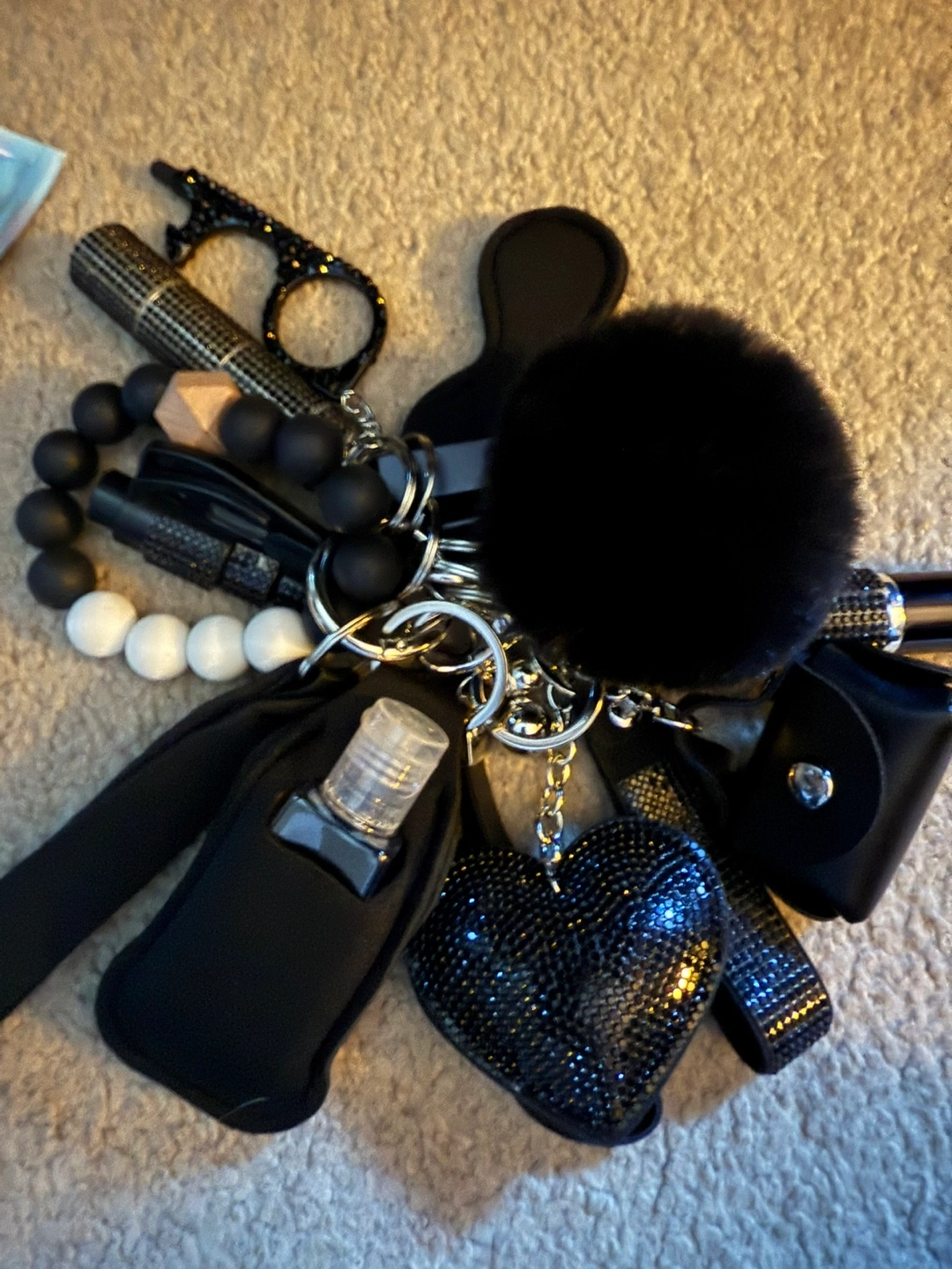 Selling a black safety keychain set. It includes a variety of items such as a pompom, a heart-shaped charm, a bottle holder, and other safety tools. Great for personal safety!