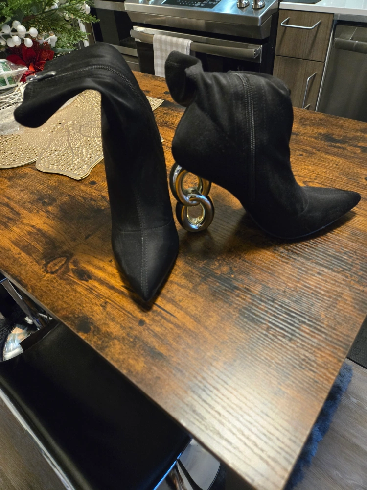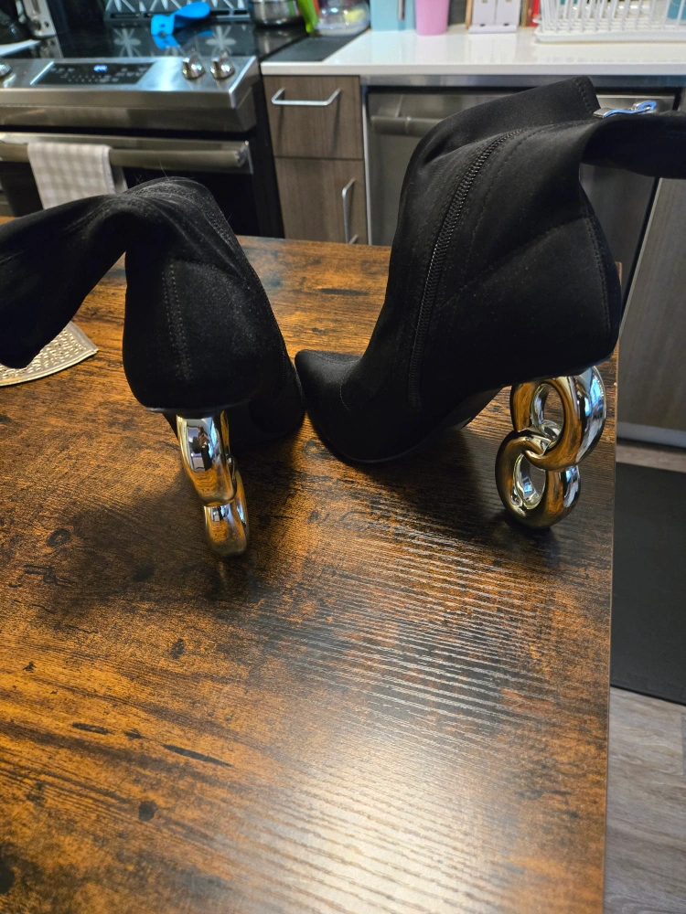 Black satin boots with a pointed toe and chain heel. Boots are calf-high and have a zipper closure on the inside of the ankle.