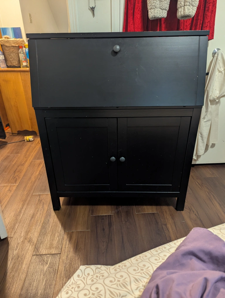 Selling a black secretary desk! It has a drop-down desktop and storage cabinets below. Great for small spaces or anyone who needs a compact workstation The back just needs to be nailed on for it to be more secure. I had my TV on this so it's definitely strong, measurements are 35" wide 18" depth 42 1/2" tall selling for my neighbor