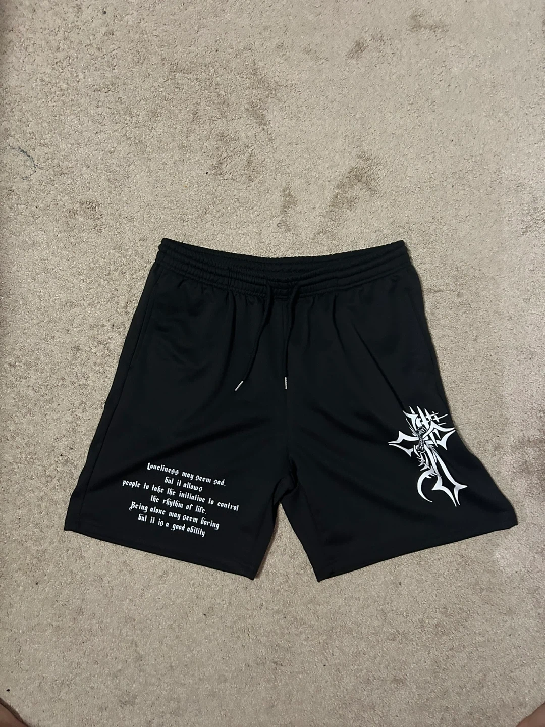 Selling a pair of black shorts! They feature a unique design on the leg and some text. Perfect for workouts or casual wear. In new condition!