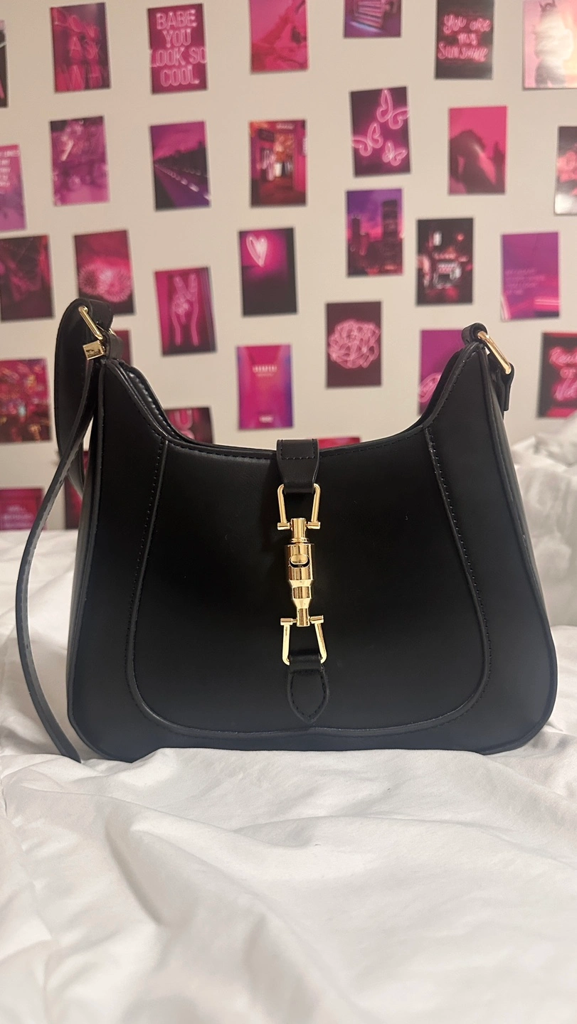Small black handbag. Features a gold clasp closure and adjustable shoulder strap. Great for everyday use.