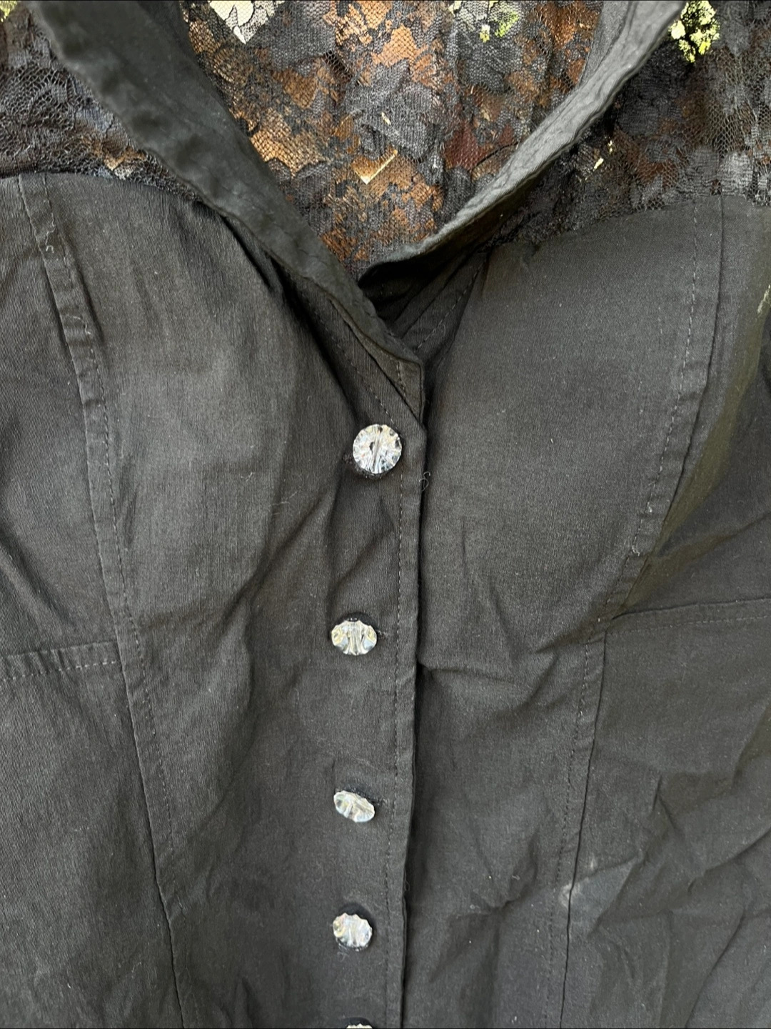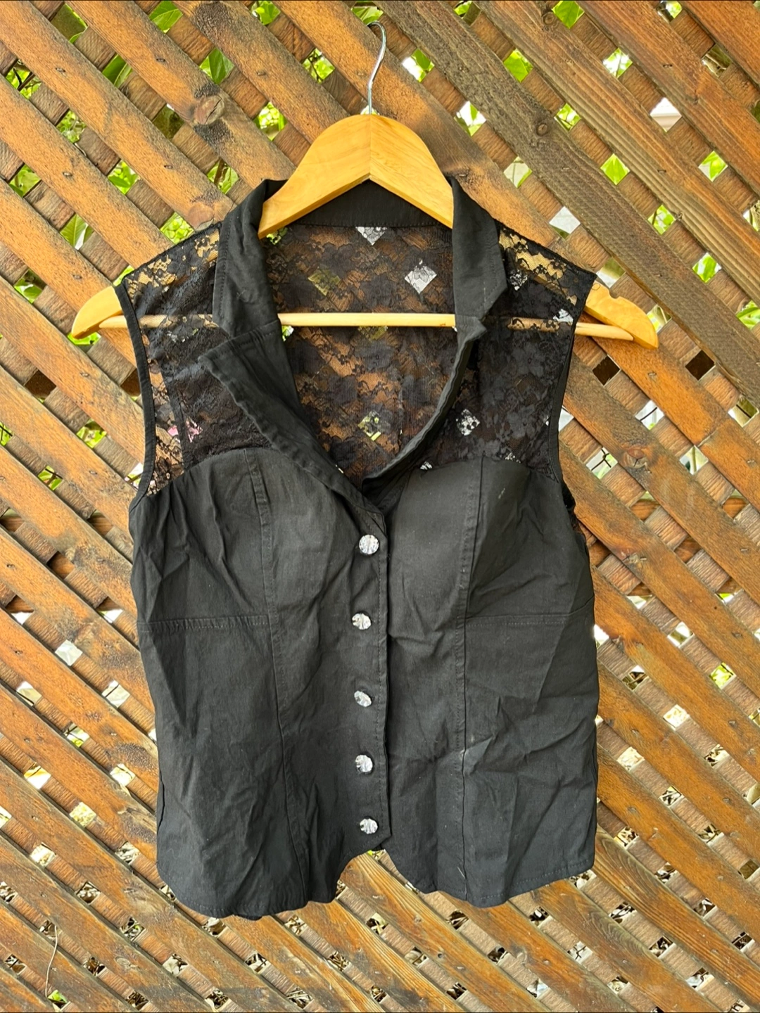 Selling a stylish black sleeveless top! It features a button-up front and a delicate lace detail on the upper back and collar. Perfect for adding a touch of elegance to any outfit!