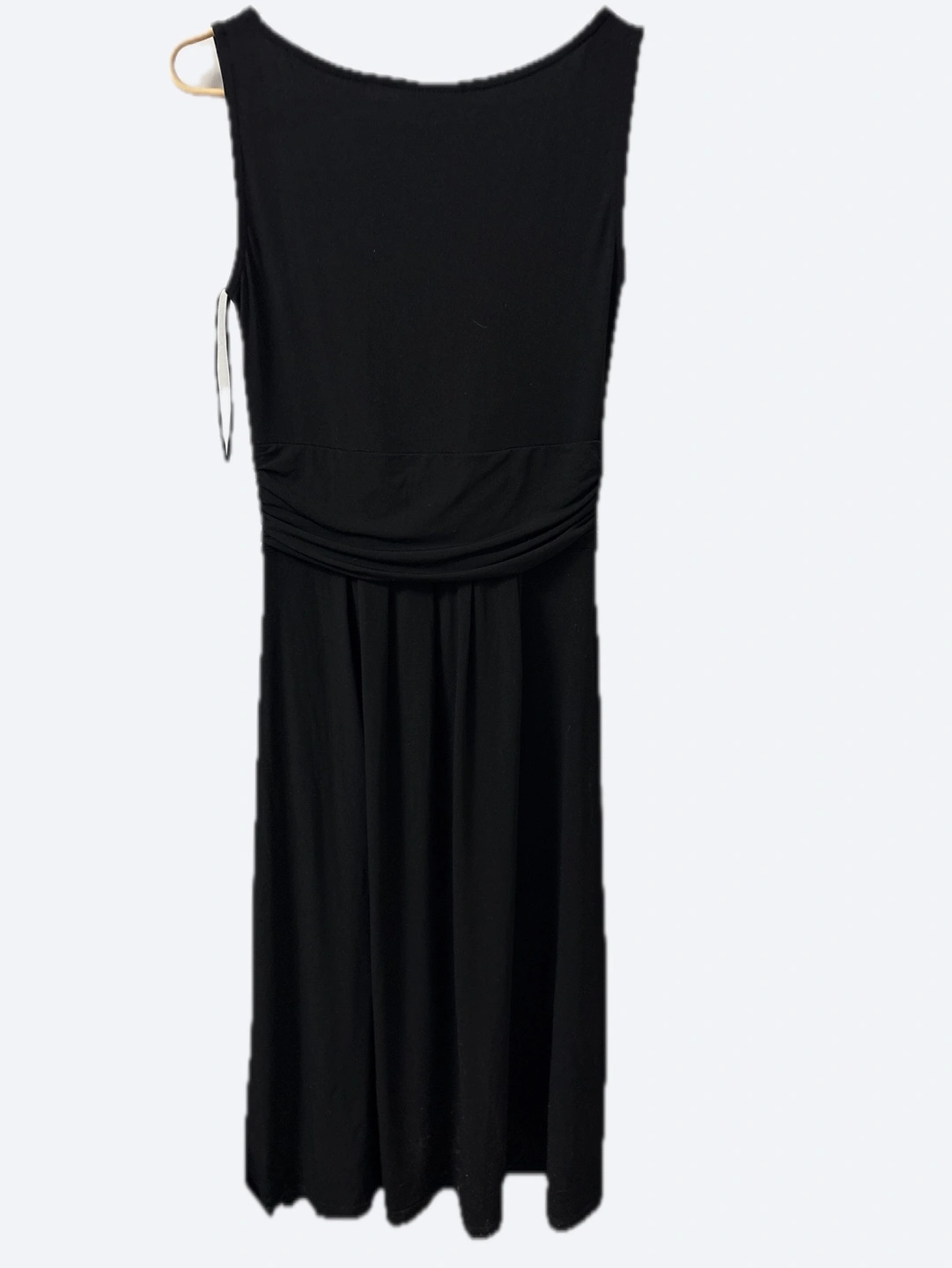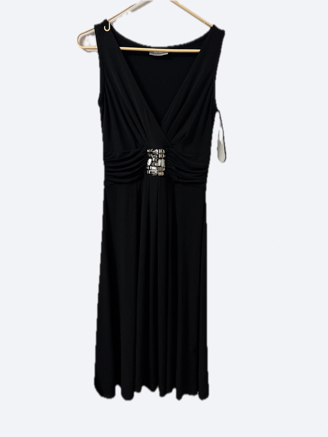 Elegant black dress. Sleeveless, fit and flare silhouette. Features a gathered waist and a jeweled embellishment at the neckline. Great for special occasions.