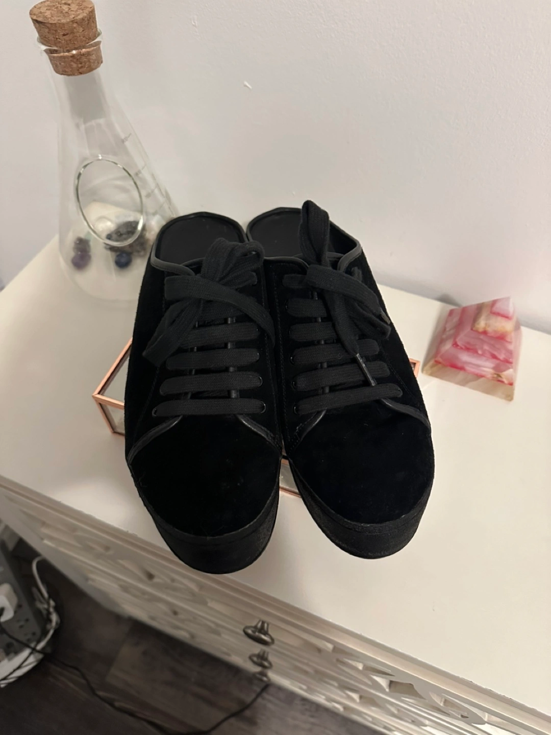 Shoes with a thick sole. Feature laces. The shoes are a slip-on design. You might like to wear these on a walk outside.