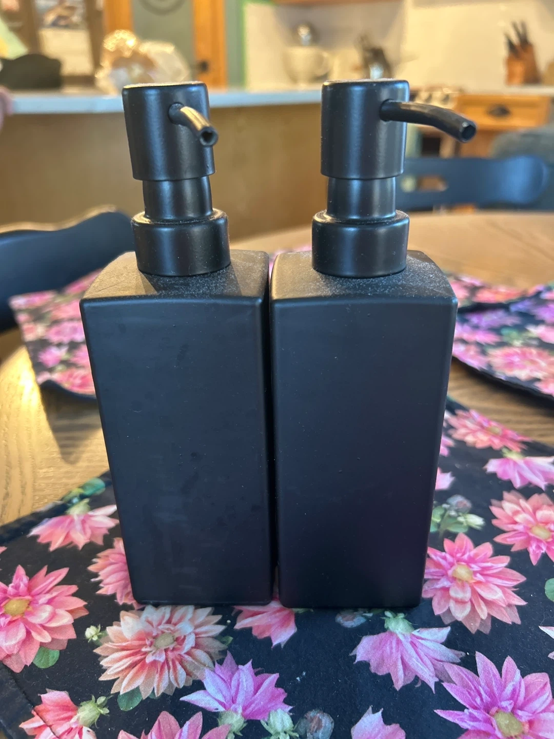 Brand new set of two black soap dispensers. They have a modern, minimalist design that would look great in any bathroom or kitchen. They are brand new and never used.