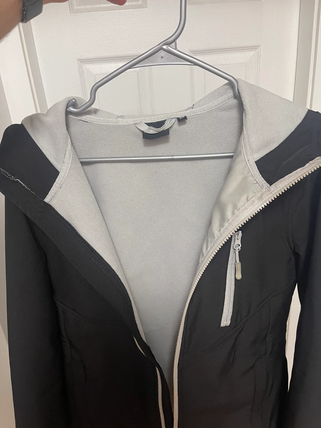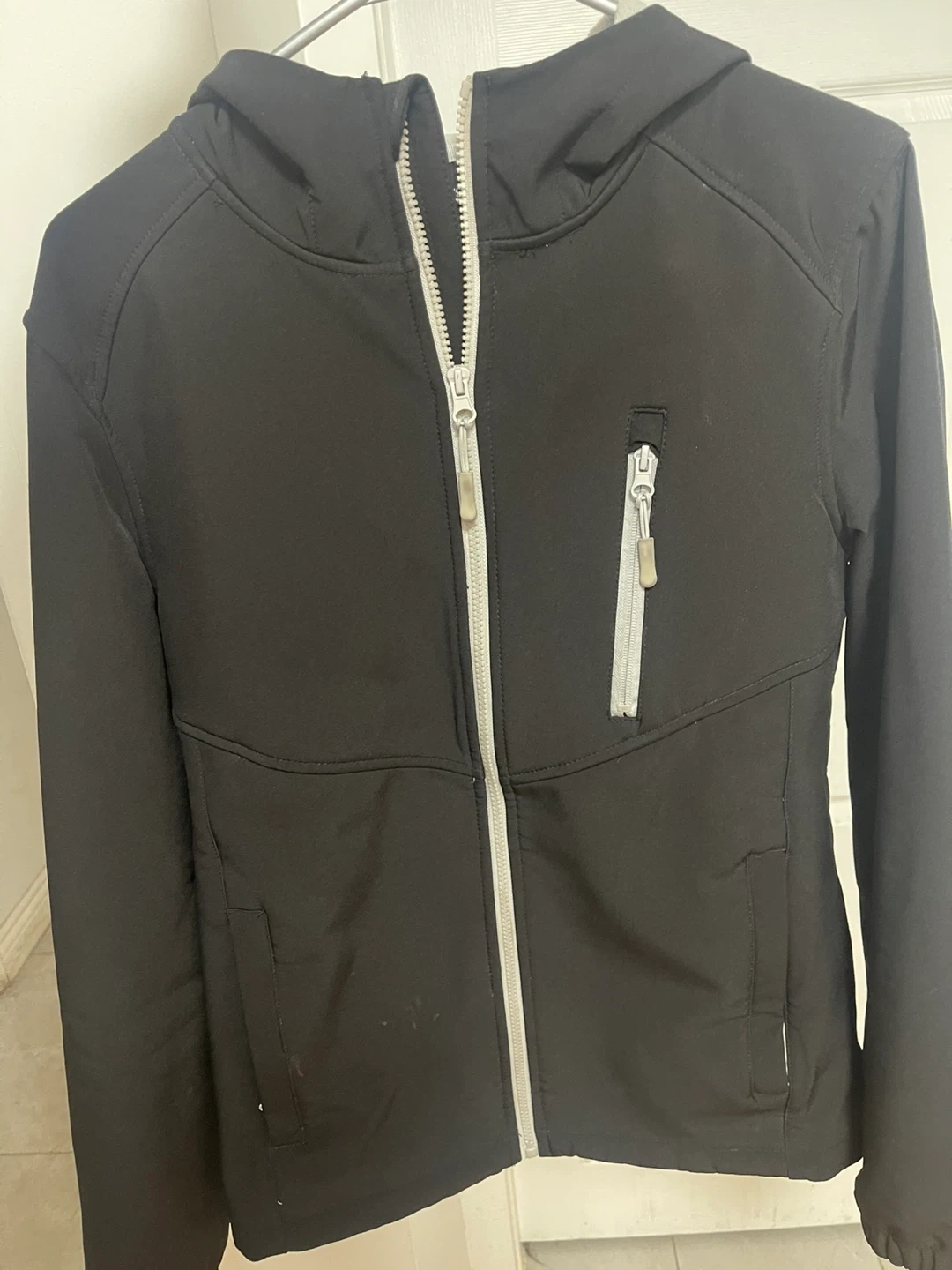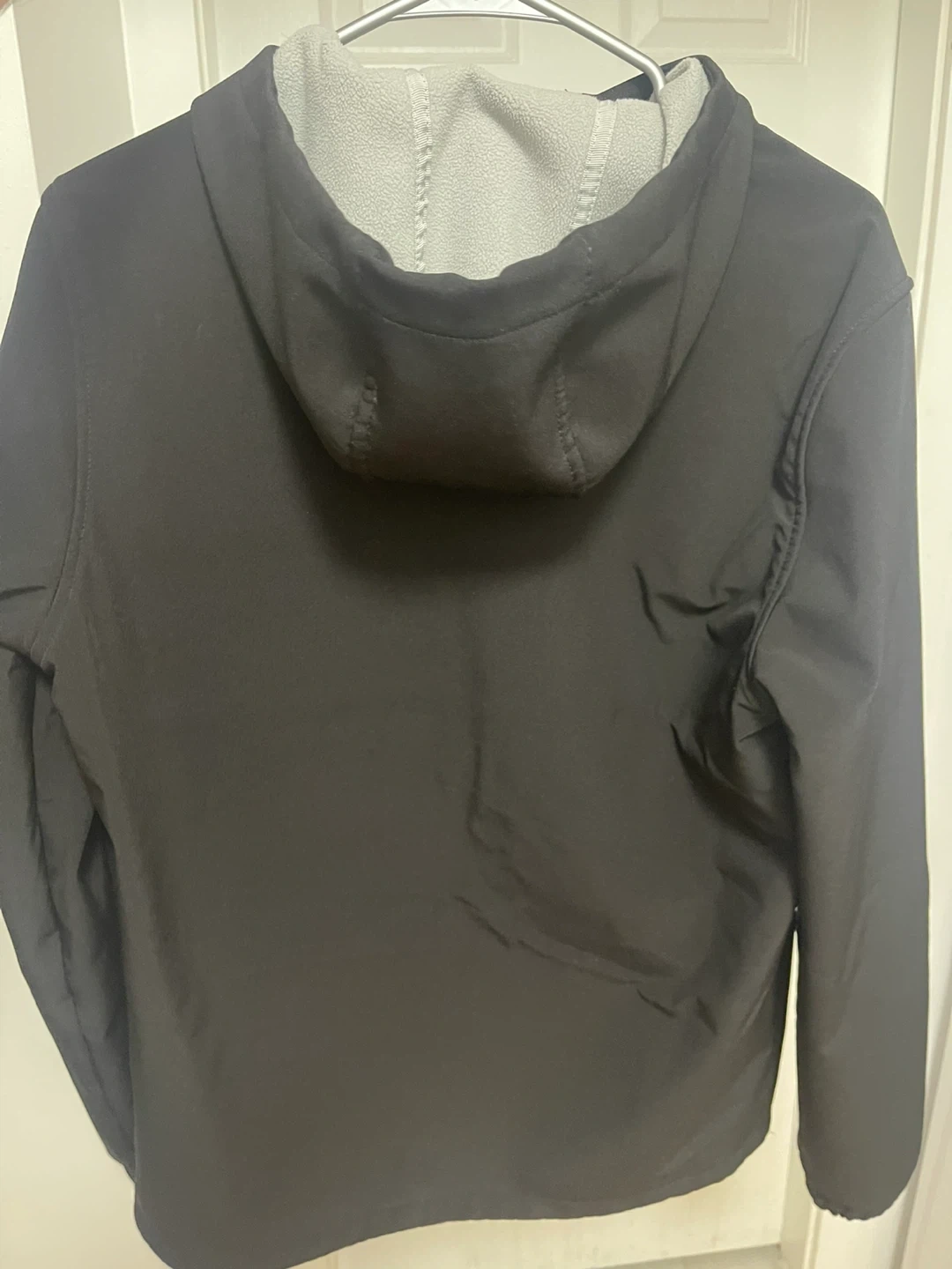 This is a black softshell jacket in size small to medium. It's in great condition and ready for a new home! The jacket features a hood and a zipper. Wind and waterproof. Unisex