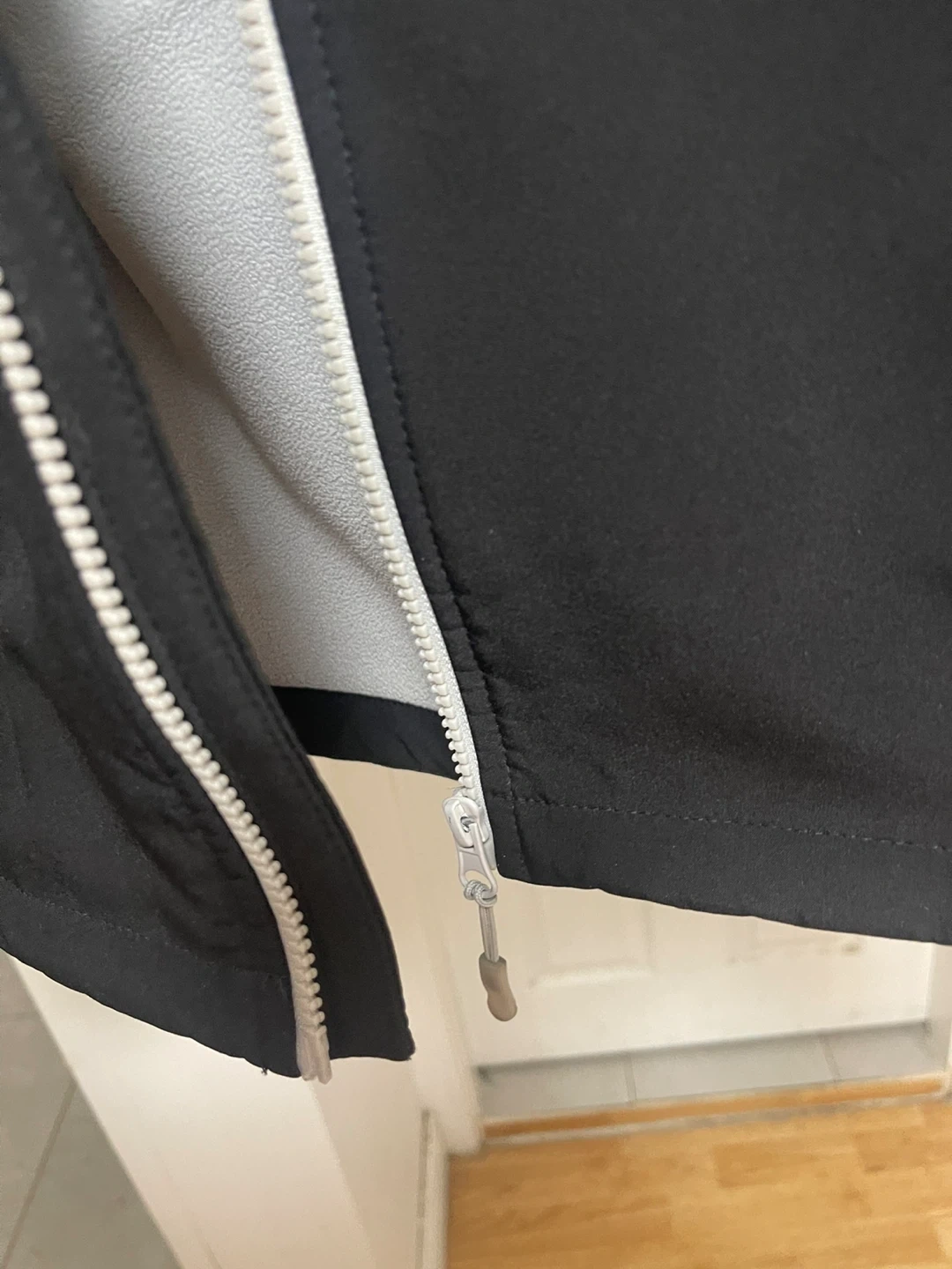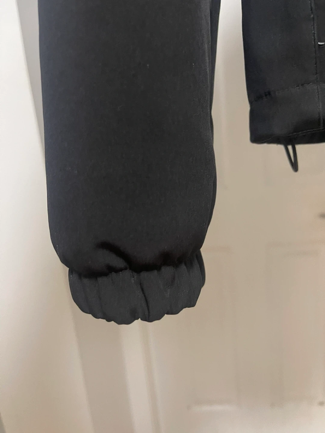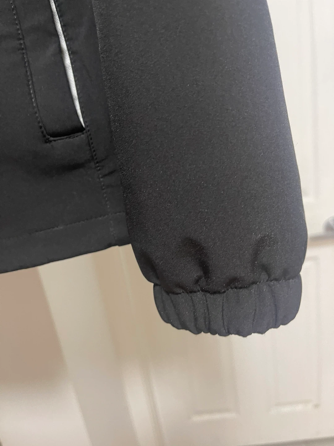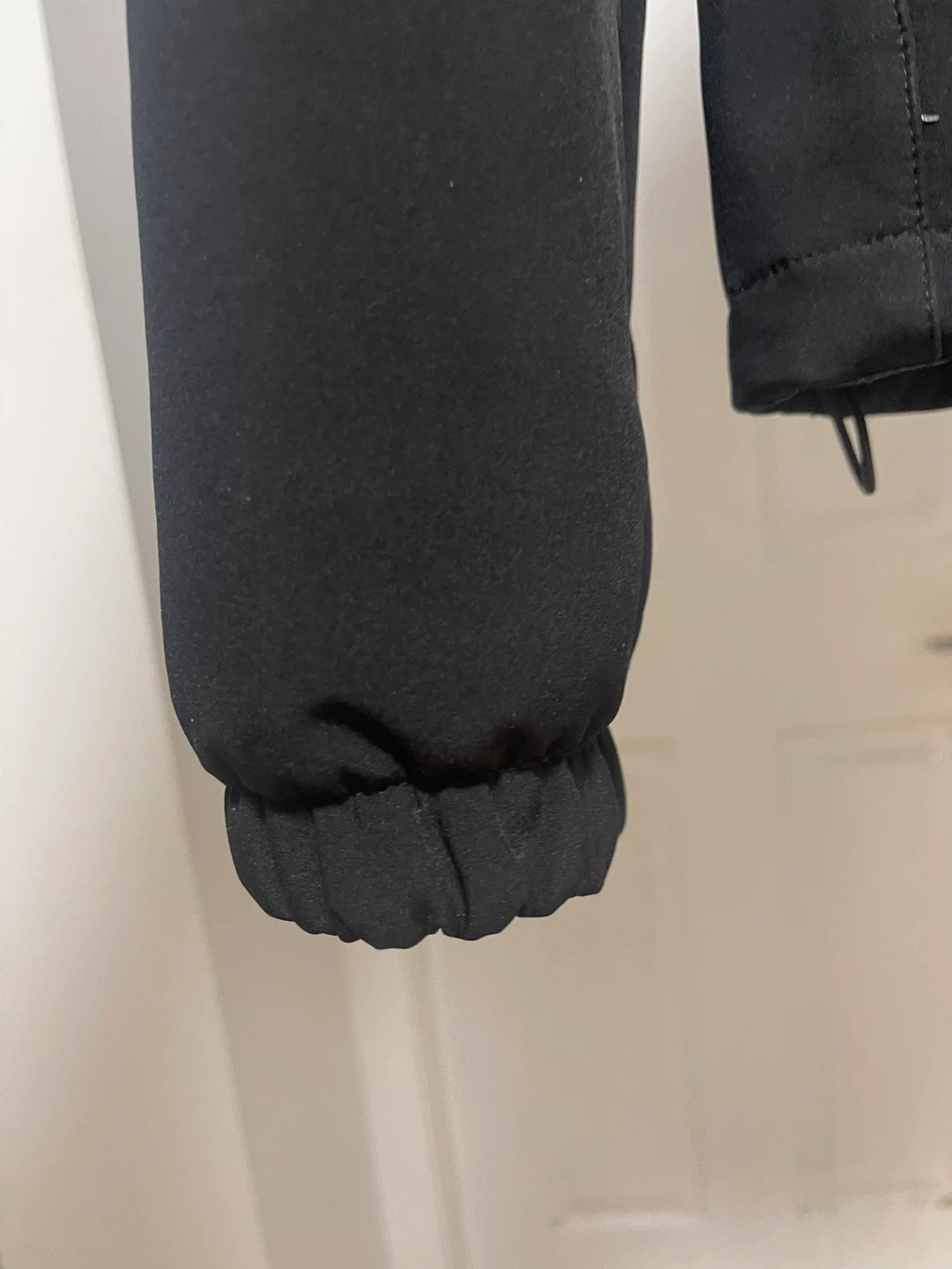 This is a black softshell jacket in size small to medium. It's in great condition and ready for a new home! The jacket features a hood and a zipper. Wind and waterproof. Unisex