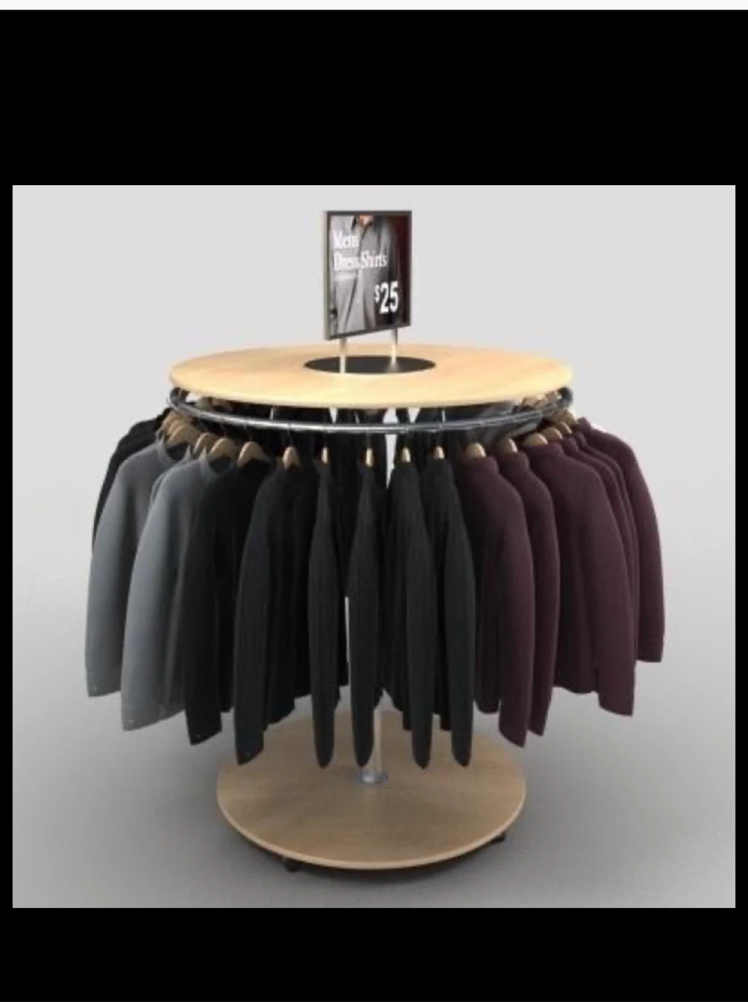 Selling a round clothes rack from Global Industrial Canada. It's great for displaying clothes in a retail setting or even at home if you have a lot of clothes! This is NOT lightweight and Comes with the rolling wheels. Holds 600 Pounds and is 5 feet across when filled. For people that LLOVE clothes and like them Organized, you will like this It's sturdy and in good condition. The original price was $455.95.