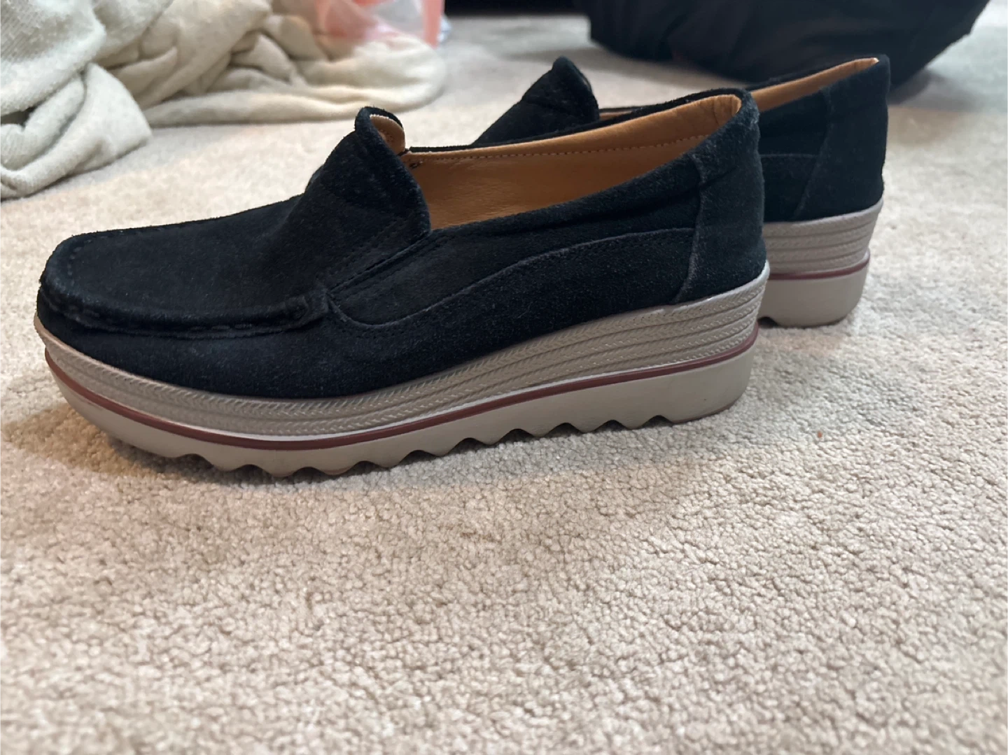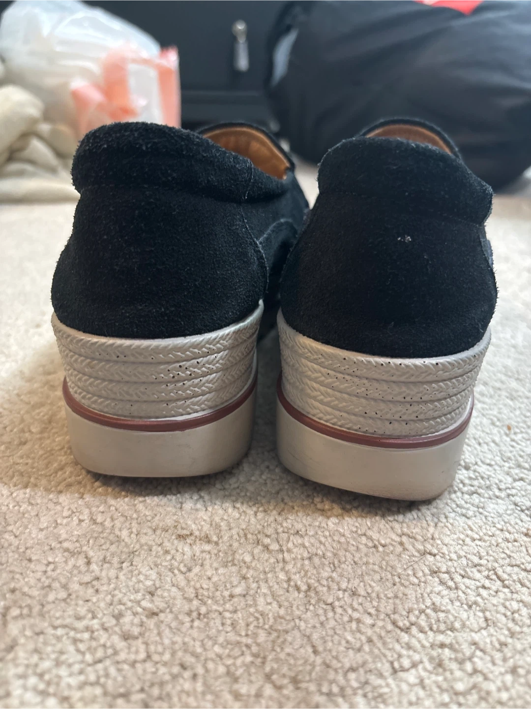 Selling a pair of black suede platform loafers. They are in great condition and are a size 8 Perfect for adding a little height and style to your everyday look!