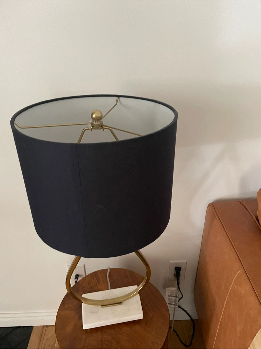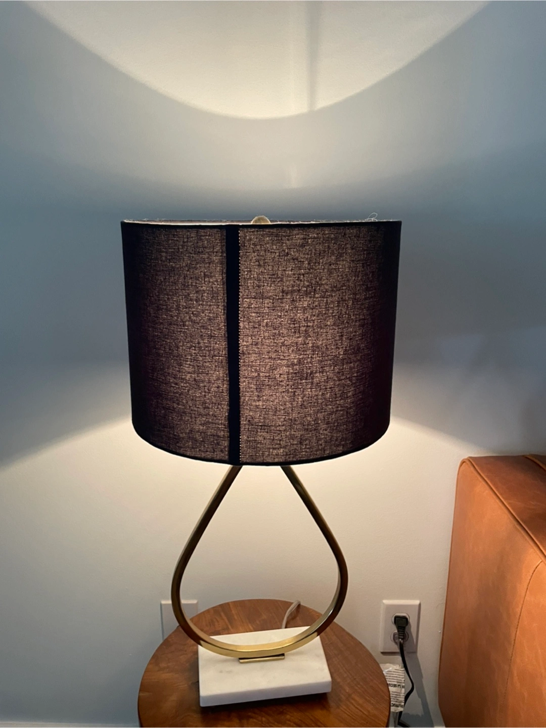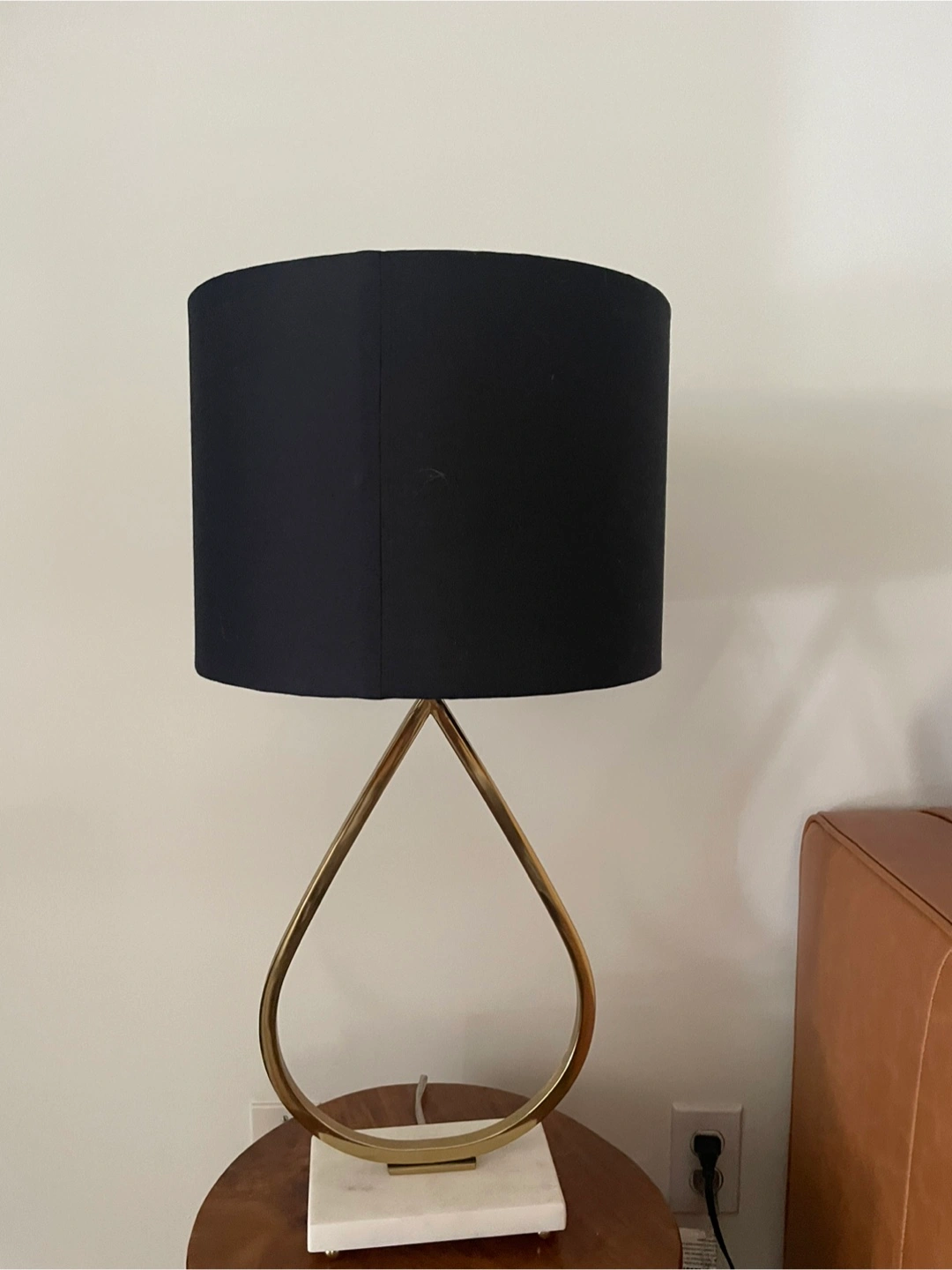 Selling a stylish table lamp featuring a black lampshade and a gold-coloured base. It's in great shape and would look lovely in any room! The base has a unique teardrop design with a white marble accent at the bottom.