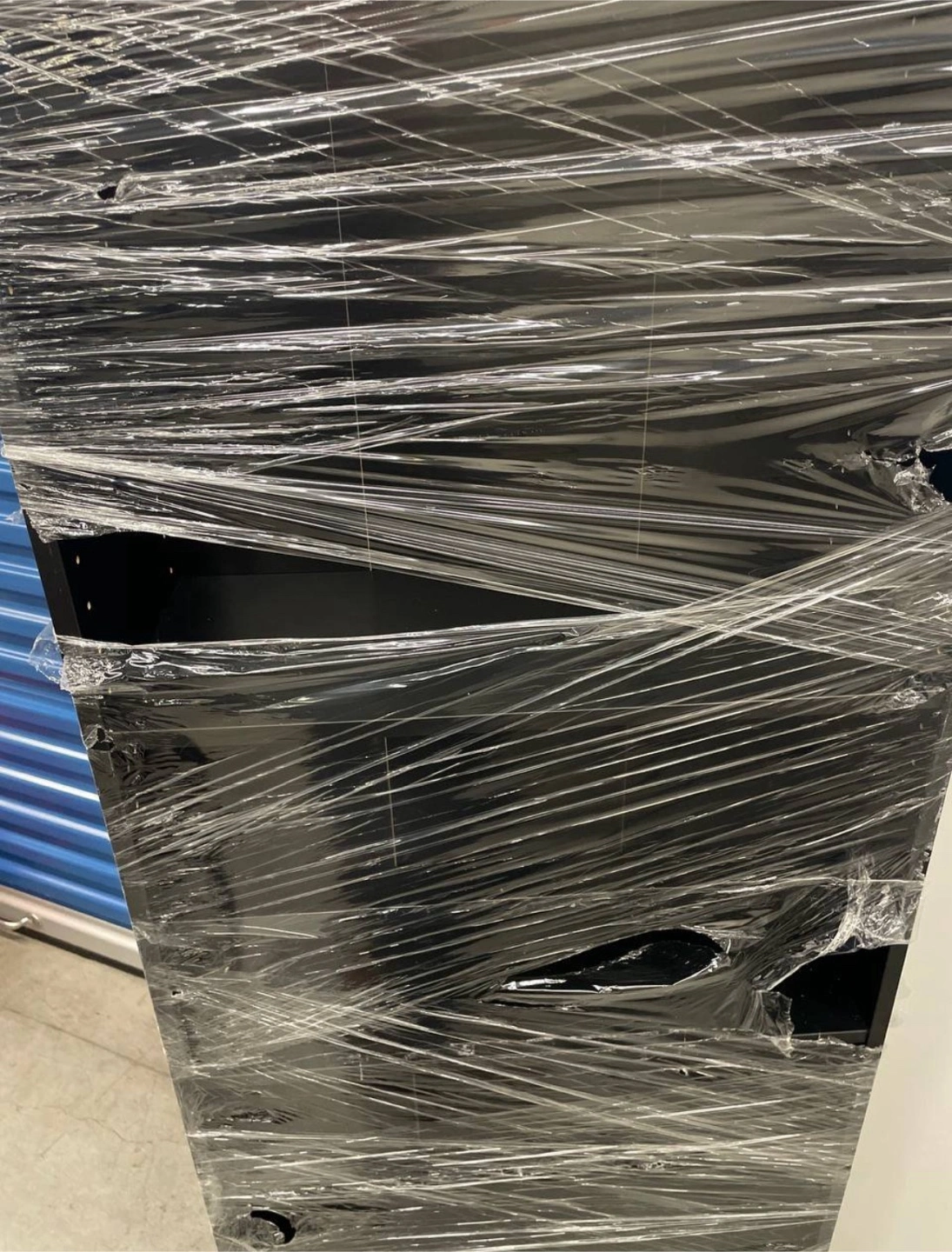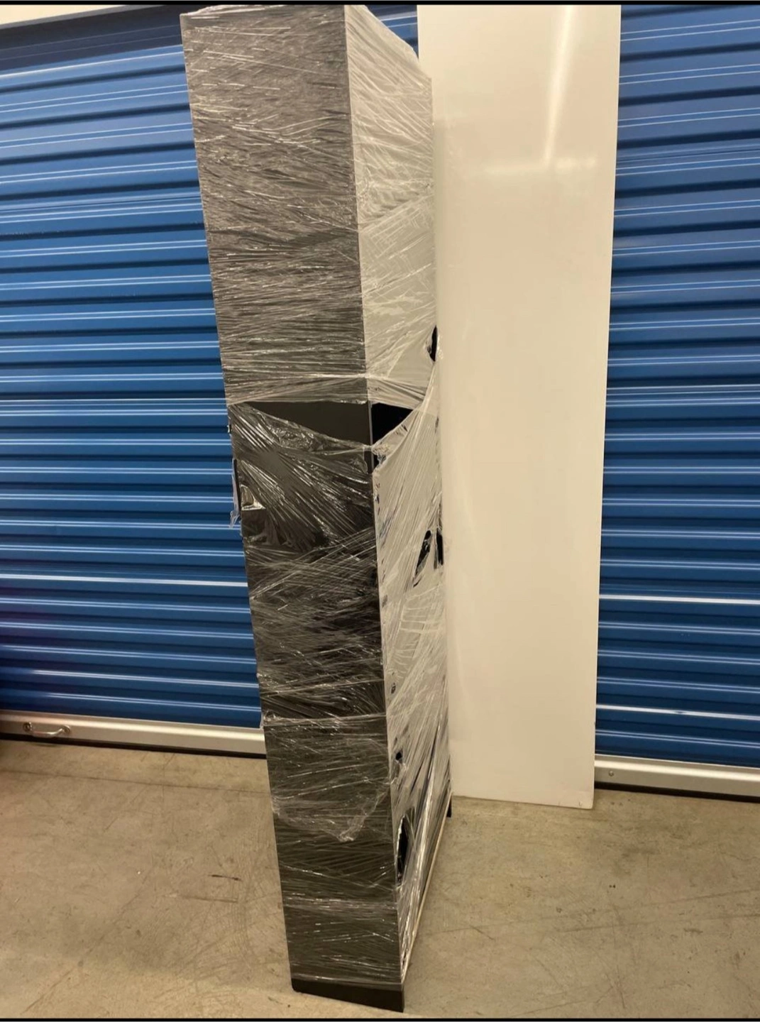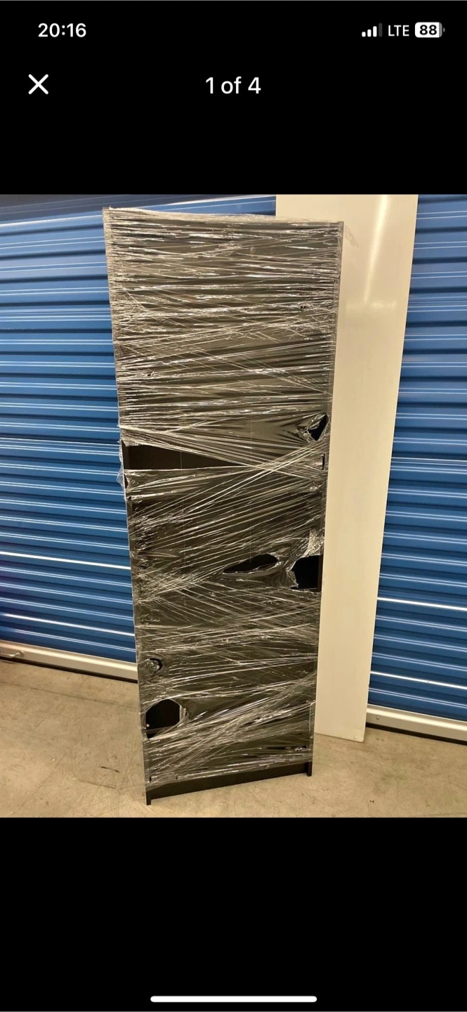 Tall black bookshelf in good condition. Already wrapped and ready for pickup — just take it as is! Perfect for books, decor, or storage. $30, pickup only (from storage, Olympic Village) after 6 PM.