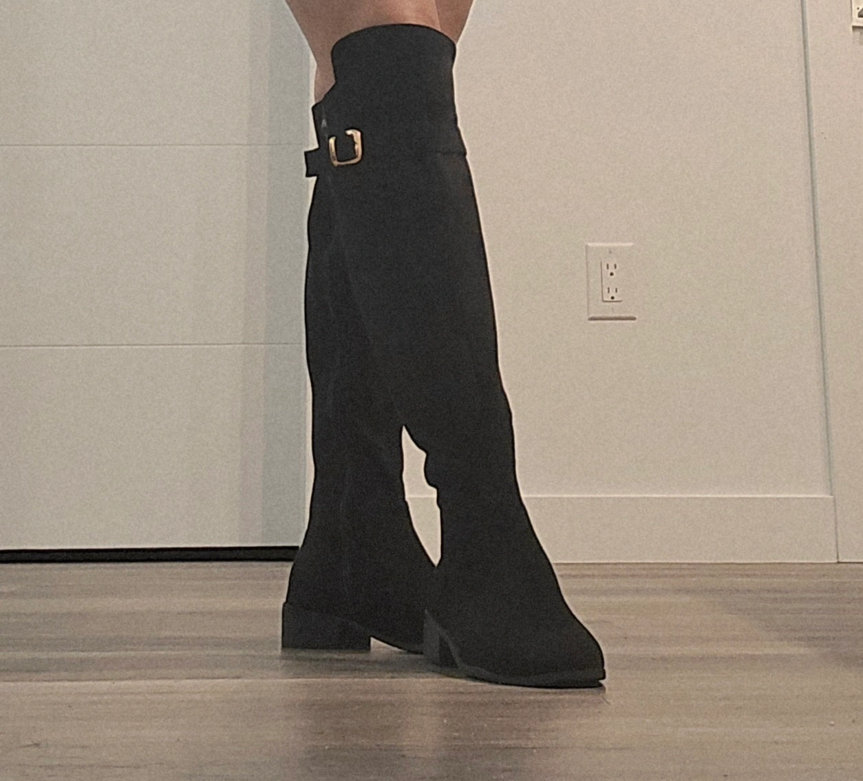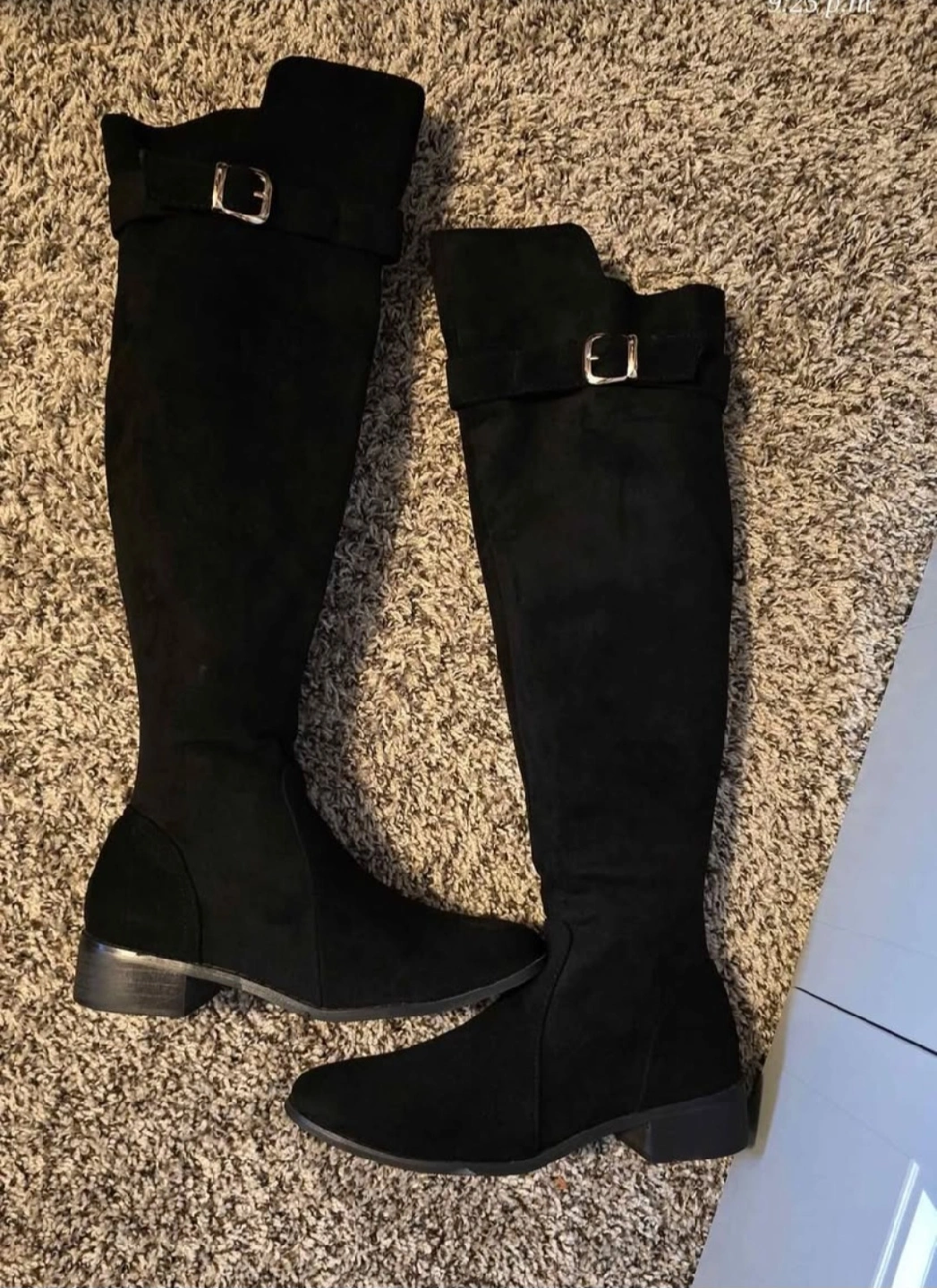 Selling a pair of black thigh-high boots in size 7. They feature a stylish buckle detail and are perfect for adding a touch of elegance to any outfit. The boots are in great condition and ready for a new home!