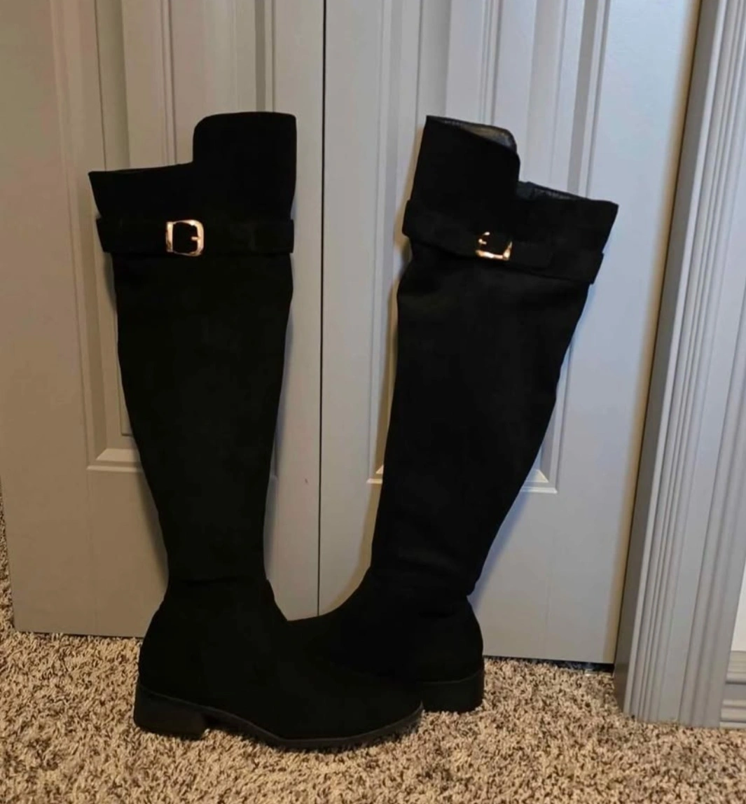 Selling a pair of black thigh-high boots in size 7. They feature a stylish buckle detail and are perfect for adding a touch of elegance to any outfit. The boots are in great condition and ready for a new home!