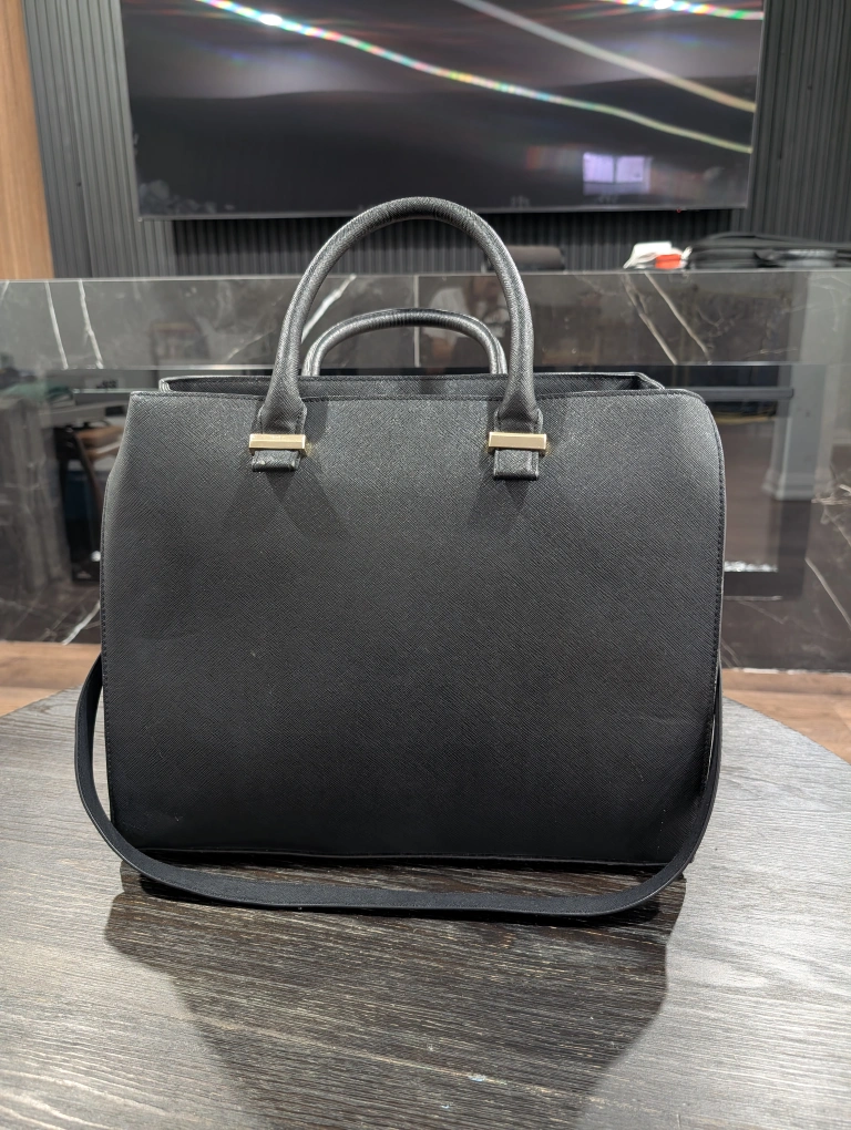 A stylish black tote bag, perfect for everyday use! It has a classic design with sturdy handles and a spacious interior. used as a school bag /teacher bag. Fits a laptop easily and more. Great for carrying your essentials in style.