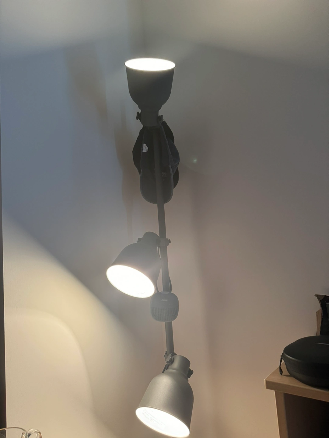This is a three-light floor lamp. It can be adjusted to direct the light in different directions. It is a stylish and functional lamp that is perfect for any home. Comes with light bulbs
