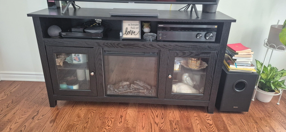 Selling a stylish black TV stand that comes with a built-in electric fireplace! It’s perfect for adding a cozy touch to your living room while providing functional storage and display space for your media devices and decor. The fireplace feature adds warmth and ambiance, making it a great addition for those chilly evenings. Contents and electronic devices pictured are not for sale, just selling the stand!