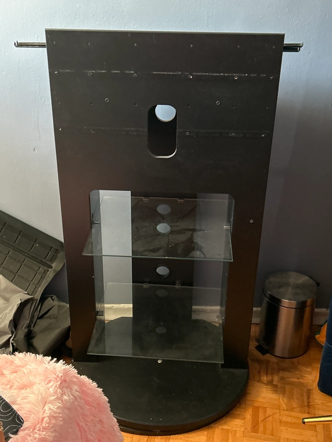 Selling a black TV stand featuring sleek glass shelves. It's perfect for organizing your entertainment system and adding a touch of modern style to your living room. It has a sturdy build and is in great condition! And it swivels