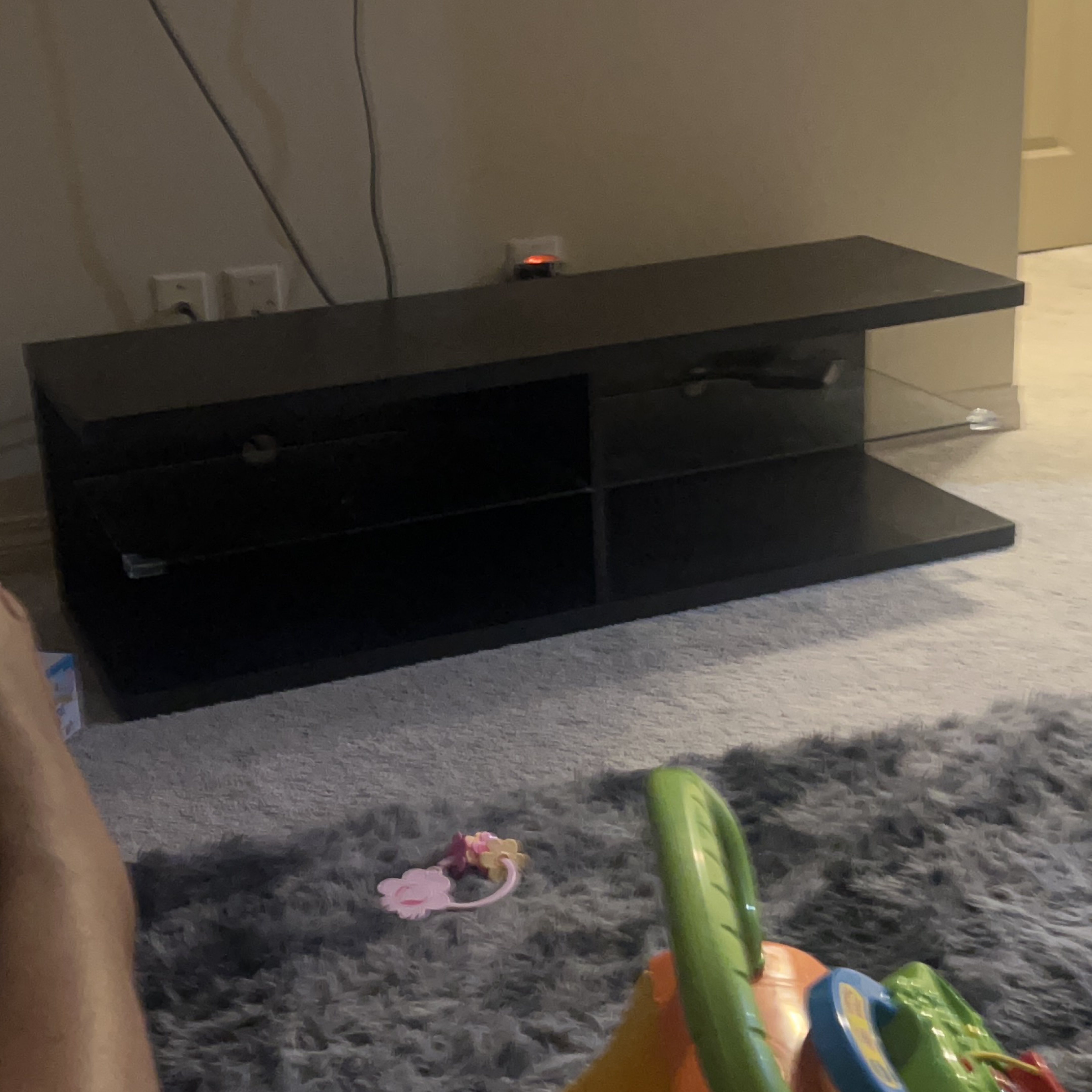 Selling a black TV stand with glass shelves. It's in good condition and would be a great addition to any living room!
