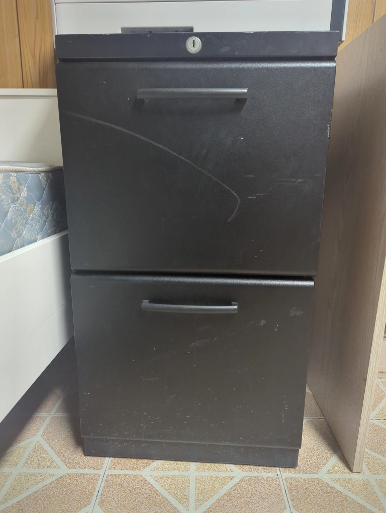 Selling a black two-drawer filing cabinet. It has some minor scratches, as shown in the pictures, but is still functional. Perfect for organizing your documents!